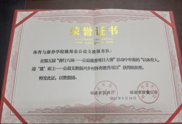 日前,由福建省民政厅指导,福建省慈善总会主办的第五届“善行八闽——公益慈善项目大赛”决赛在福州举办。体育与康养学院报送的“以体育人,迎‘篮’而上——公益支教振兴乡村体育教育”“体卫融合助力健康苏区建设”两个项目获得组织奖。