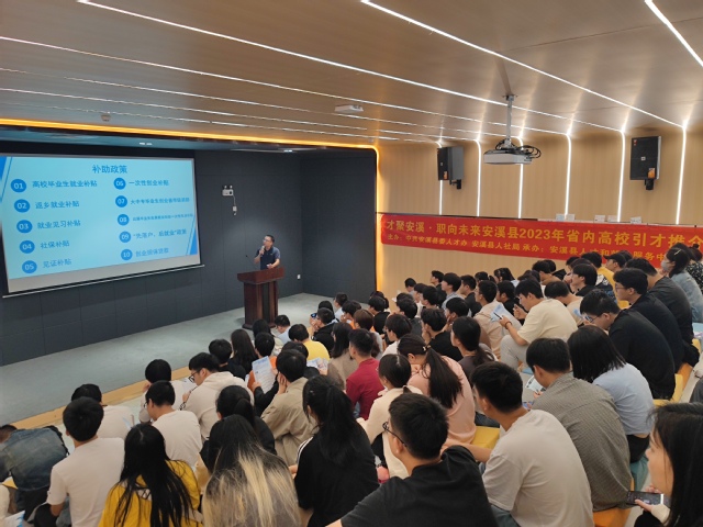 引才推介会上,安溪县人才办、人社局围绕高校从住房保障、生活补助、公共服务、研学培训、创新创业支持等方面对安溪县人才政策进行了推介,让在场学生更加直观地了解安溪引才政策和育才环境。福建泉州闽光钢铁有限责任公司、安溪县尚品千艺模型有限公司、福建粒量科技有限公司、福建晶安光电有限公司和泉州立旺食品有限公司等安溪县优质企业代表向在场毕业生介绍了企业发展状况和人才招聘需求,满怀诚意向毕业生抛出橄榄枝,毕业生们纷纷向心仪企业投递简历,现场互动热烈。