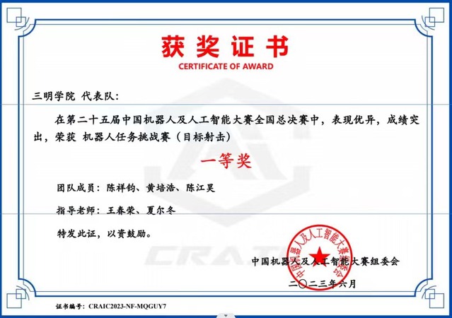 日前,三明学院机电工程学院学子在第二十五届中国机器人及人工智能大赛全国总决赛中荣获全国一等奖1项,全国二等奖1项以及福建省一等奖、福建省二等奖佳绩。