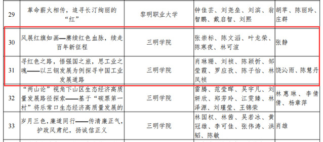 本次竞赛“红色专项”活动中,全省共评出特等奖作品5件、一等奖作品15件、二等奖作品30件、三等奖作品50件。艺术与设计学院成绩喜人,作品《山川无阻,一往情深:书写新时代对口合作新篇章——基于三明市的沪明合作成效调查研究》荣获二等奖;《风展红旗如画——赓续红程色血脉,续走百年新征程》《寻红色之路,悟强国之旅,思工业之魂——以三钢发展为例探寻中国工业发展道路》荣获三等奖。