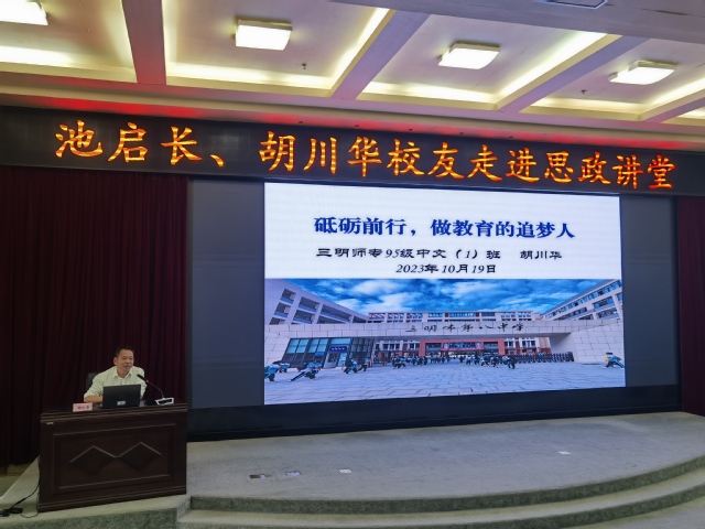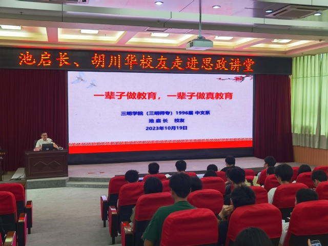 为持续发挥优秀校友的榜样引领作用,夯实校友协同育人模式,10月19日上午,三明学院校友思政讲堂第三期在图书馆学术报告厅举行。1994级中文专业校友、三明市第二中学副书记、副校长,三明市列东中学党总支书记池启长及1995级中文专业校友、三明市第八中学党总支书记胡川华受邀为学校师生作了一场思政报告。校党委书记赖锦隆亲切会见了两位校友。校友会、马克思主义学院、信息工程学院、机电工程学院、资源与化工学院师生代表参加了活动。