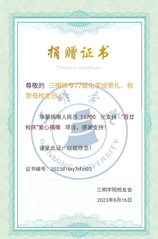资化学院首届毕业生,原三明地区师范大专班化学教育专业1977级校友们在班主任周文富教授及班干部的倡议下,全体校友积极响应,短时间为学院校庆筹资1.17万元,带头向母校校庆捐赠献礼。近期,资化学院校友分会先后收到其他班级校友的集体、个人捐赠款项60余笔,目前收到爱心捐赠款46.8万元,其中校友爱心捐赠16.8万元,合作企业捐赠30万元。