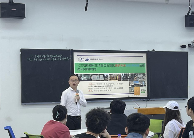 10月26日上午,建筑工程学院副教授安显楼于外语楼B102智慧教室以“三明徐碧村汪顷居历史建筑保护传承活化再利用的理论及实践探索”为题进行案例式学术分享。来自建筑工程学院、艺术与设计学院、经济与管理学院、海峡理工学院相关专业的近50余名师生及海峡两岸乡村融合发展试验区相关研究学者展开学术交流,建筑工程学院主持工作副院长曾武华主持讲座。
