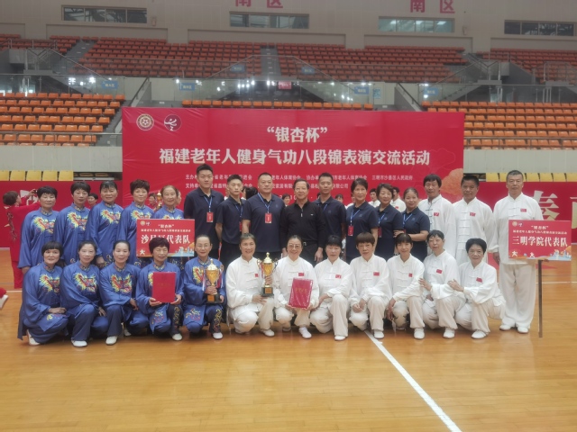 重阳节当日,离退休教职工代表三明学院参加省老体协组织的“银杏杯”八段锦比赛交流活动,队员们动作整齐、收放自如,荣获比赛优秀奖。市老体协主席刘鑫与队员们亲切合影。