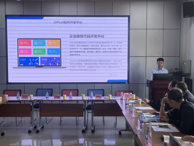 会议中,陈飞董事长介绍了公司在数字经济建设方面所取得的成就和同其他高校合作的教学经验,并提出希望通过校企合作的方式共同提升同学们数字经济专业技能的想法。叶志鹏书记强调要以新工科、新文科建设为引领,做强优势学科专业,形成人才培养高地,用“如何通过建立实验室以满足教学需求”的问题,切入数字经济实验室项目对接交流,在交流中企业代表周宇先生向大家详细介绍了J2PaaS软件开发教学平台,希望通过校企合作,产教、实训融合的教学模式,助力高校培养综合性技术人才。