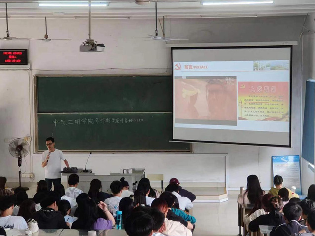 开班第一课,赖鑫焘老师为学员们讲授了以《中国共产党的性质和宗旨》为主题的专题党课。赖鑫焘老师从党的阶级基础,群众基础,地位与作用,先进性,最高理想和最高目标等方面系统地进行了详细解说,引导学员重视理论学习,提高党性修养,进一步加深对党的基本知识的了解和掌握。同时,他也寄语各位学员要用习近平新时代中国特色社会主义思想凝心铸魂,志存高远、脚踏实地,要把课堂学习和实践紧密结合起来练就过硬本领,为实现中华民族伟大复兴贡献青春力量。赖鑫焘老师生动有趣的授课获得了阵阵掌声,现场气氛热烈。