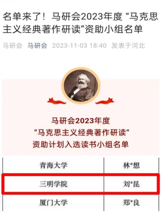 近日,中国高等教育学会马克思主义研究分会(以下简称“马研会”)公布2023年度“马克思主义经典著作研读”资助计划入选读书小组名单,三明学院马克思主义理论读书社成功入选。