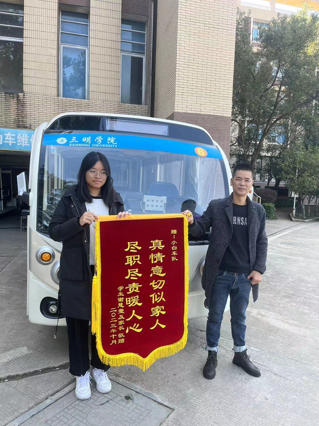 经过一段时间休养后,谢慧莹同学已康复返校报到,她和家长对小白车队的热心服务念念不忘,感恩小白车队的辛勤付出和无私奉献、、不求回报的精神,11月18日特将一面印有“尽职尽责暖人心,真情意切似家人”的锦旗送到小白车队,“谢谢小白车队师傅,帮了我们一个大忙”谢慧莹同学说道。当日负责接送的师傅林得锋憨笑着说“这本就是一件很平常的事情,也是职责所在,学生就像自己的孩子一样,看到孩子不方便自己内心就会觉得必须为他们做点什么”。