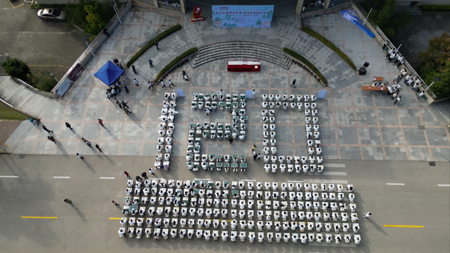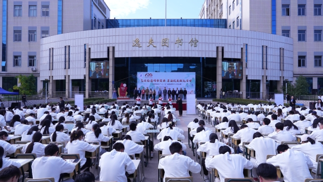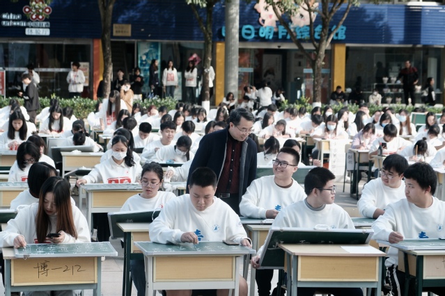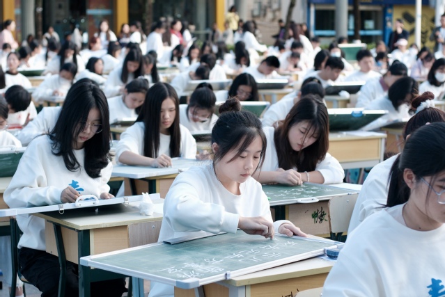阳光下,数百张桌椅整齐摆放,拼出“120”字样。伴随着悠扬的古风曲,近1100名学生分时段、流水式端坐在书桌前,气定神凝,或悬腕运笔,或伏案书写,场面蔚为壮观。