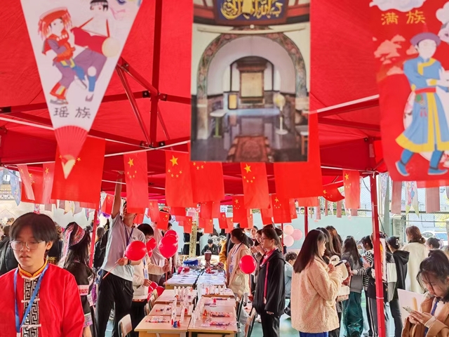 伴随着现场响起独具民族风情的音乐,活动正式开始。同学们纷至沓来,奔向自己感兴趣的“文化摊位”。民族文化DIY体验区摆放了与各民族形象相似的石膏娃娃与挂画,供大家设计、涂色,让同学们在放飞想象力的同时充分感受民族文化的美丽。民族美食品尝区准备了各民族独具特色的美食:藏族的耗牛干、酥油茶;苗族的茶饼、刺梨冻;哈萨克族的奶酪、伊犁果丹皮……琳琅满目,令人垂涎欲滴。民族文艺演出则将此次活动推向高潮,少数民族演员载歌载舞,欢唱着《相亲相爱》。此外,现场准备了数棵祈福树,同学们纷纷挂上木牌,送出“56个民族一家亲”的美好祝愿。活动尾声,同学们穿戴上现场展出的民族服饰与饰品,与祈福树合影留念。
