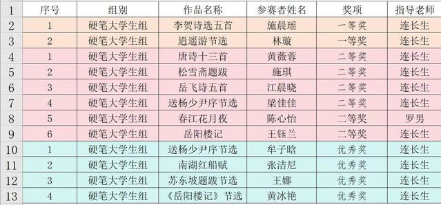 在第五届中华经典诵写讲大赛“笔墨中国”汉字书写大赛评比中,由连长生老师指导的文化传播学院学生施晨瑶作品《李贺诗选五首》、林璇作品《逍遥游节选》荣获一等奖;由连长生老师指导的黄薇蓉作品《唐诗十三首》、施琪作品《松雪斋题跋》、江晨晓作品《岳飞诗五首》、梁佳佳作品《送杨少尹序节选》、王钰兰作品《岳阳楼记》,罗男老师指导的陈心怡作品《春江花月夜》荣获二等奖;由连长生老师指导的牟子晗作品《送杨少尹序节选》、张洁尼作品《南湖红船赋》、王娜作品《苏东坡题跋节选》、黄冰艳作品《岳阳楼记》节选荣获三等奖。