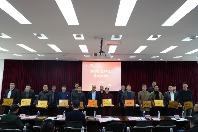 12月29日,三明学院120周年校庆总结表彰会在行政楼八楼会议室举行。校领导赖锦隆、廖景榕、李莉星、吴龙、谢松明、林建伟、游龙桂,各部门负责人、各二级学院党政负责人,受表彰的先进集体、先进个人、优秀青年志愿者等师生代表参加会议。校党委副书记李莉星主持会议。