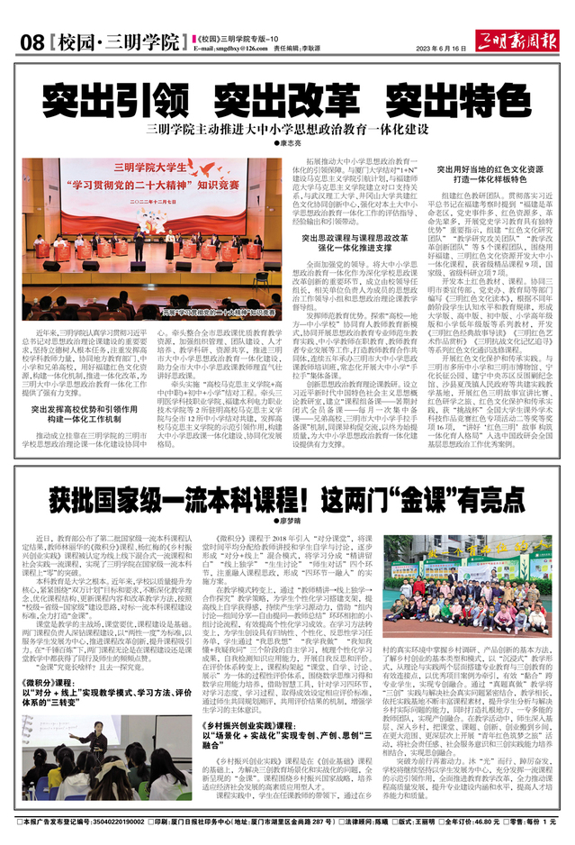 【三明新周报】突出引领 突出改革 突出特色——三明学院主动推进大中小学思想政治教育一体化建设