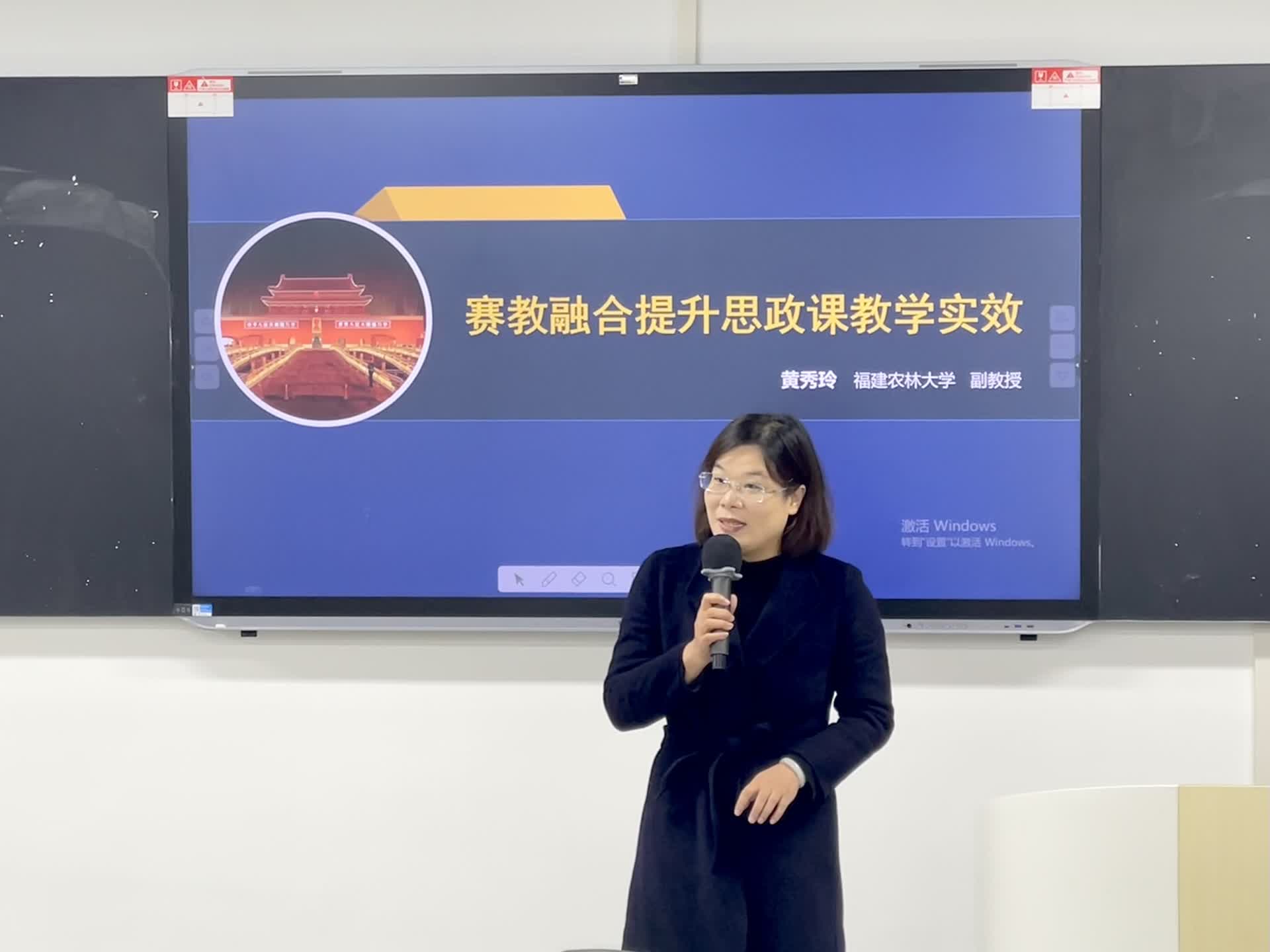 受邀参加的福建农林大学马克思主义学院副教授黄秀玲老师首先以“赛教融合提升思政课教学实效”为主题,介绍了教学竞赛类型与要求,分享她参加各类思政课教学比赛的经验。她着重根据国家和省思政课教学大赛的具体要求讲解了如何做好教学设计内涵与实施,并结合实际教学实践,以“走中国式工业化道路”为题进行了教学设计展示与教学分享,引导思政课教师要正确处理好教学比赛与日常教学等关系,努力做到赛教融合提升思政课教学实效,鼓励青年教师要积极参加各级各类思政课教学大赛,通过教学大赛促进个人教学能力和水平的提升。