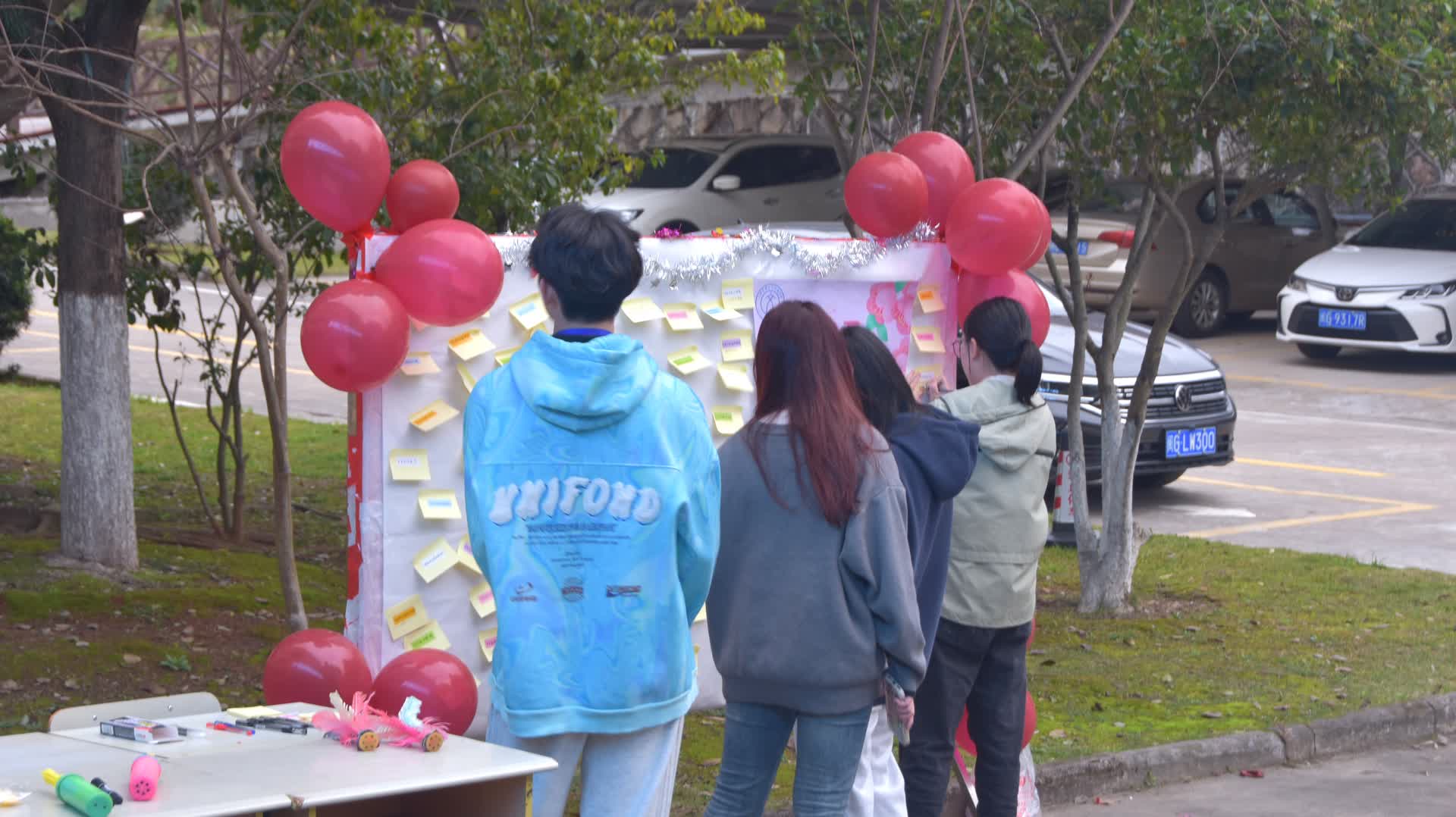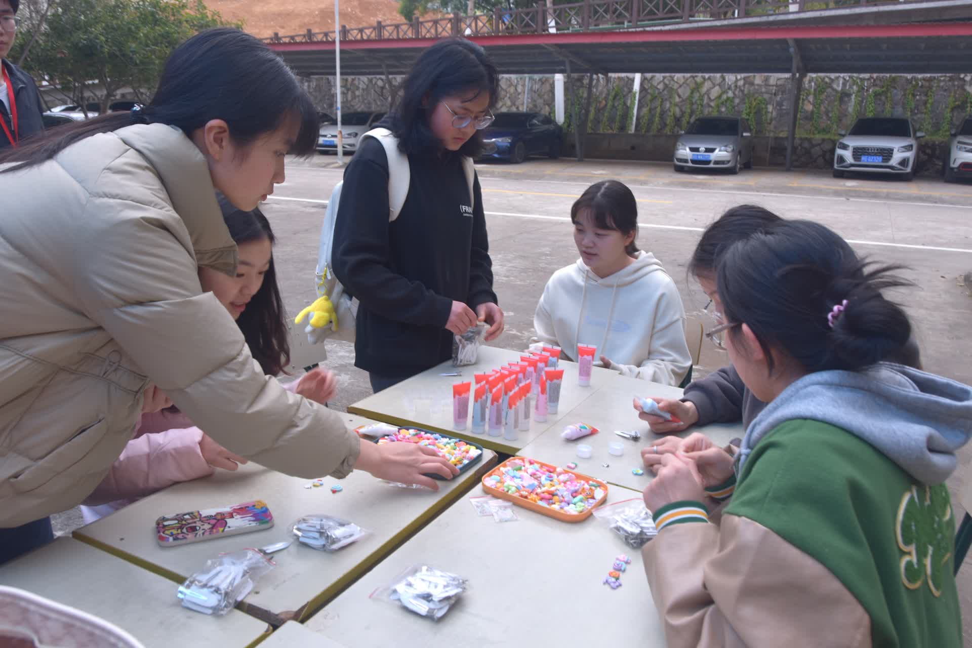 活动现场布置精美、氛围温馨,女生们手持奶油胶和树脂配件,DIY出独一无二的奶油胶发夹,将自己的创意和热情融入其中。留言墙前,大学生用笔尖写下对女性的深深祝福和赞美,每一个字句都充满温馨。参加活动的同学积极参加“对诗”,机智地应对的成功者会赢得一份份精美小奖品,欢声笑语洋溢在空气中。