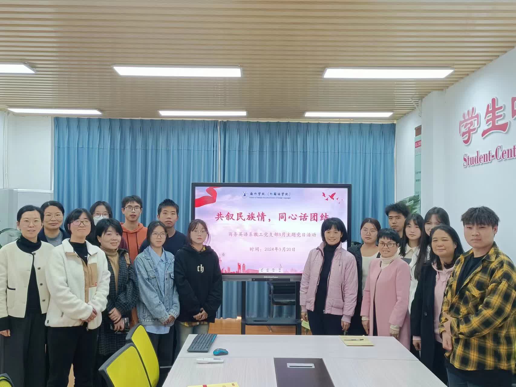 为深入学习贯彻习近平总书记关于加强和改进民族工作的重要思想,深入践行学校“三引三提”行动要求,有形有感有效推动铸牢中华民族共同体意识深入人心,3月20日下午,海外学院(外国语学院)教工党支部开展“共叙民族情,同心话团结”主题党日活动,全体教师党员、在校生少数民族学生参加了此次活动。