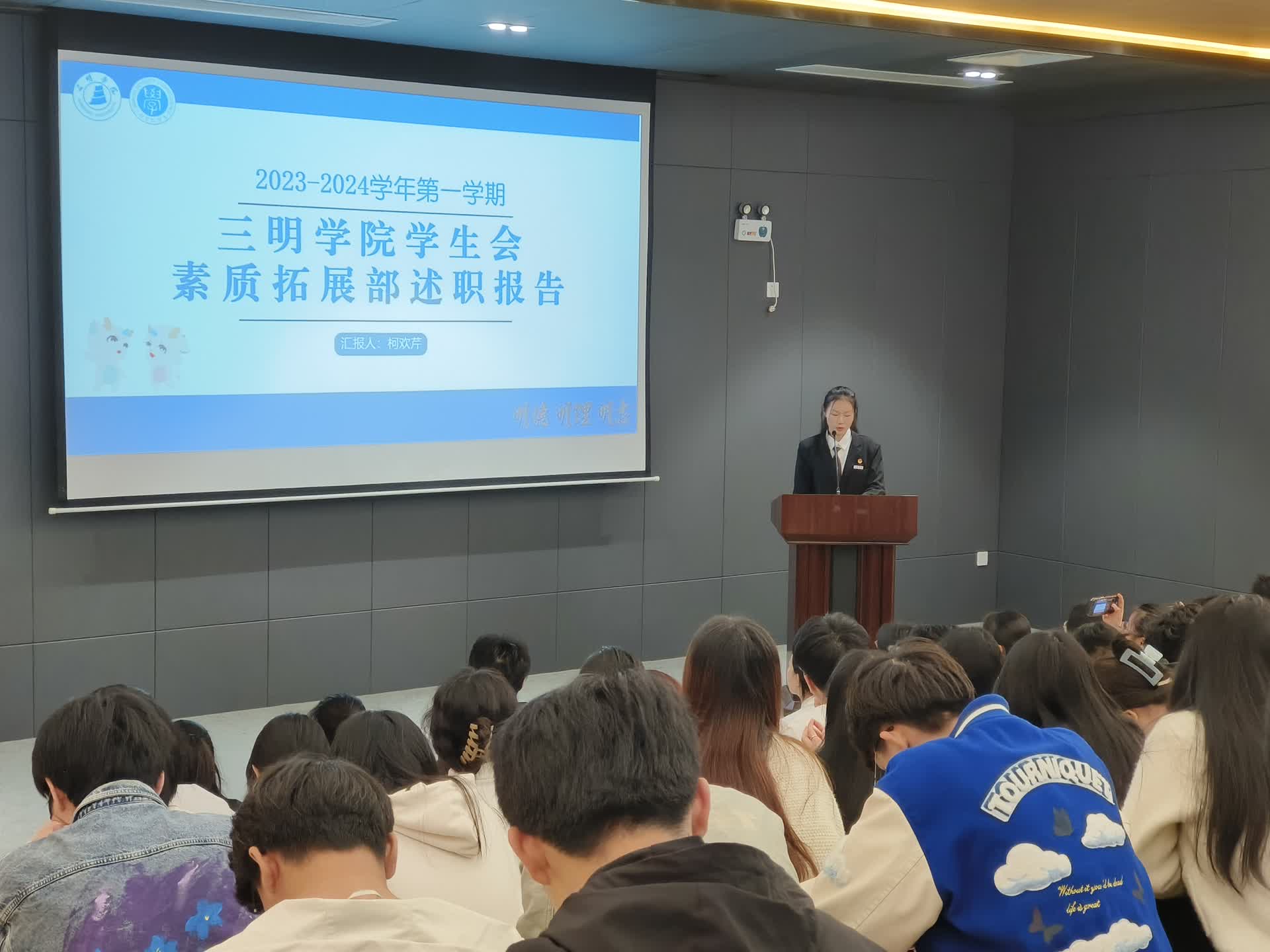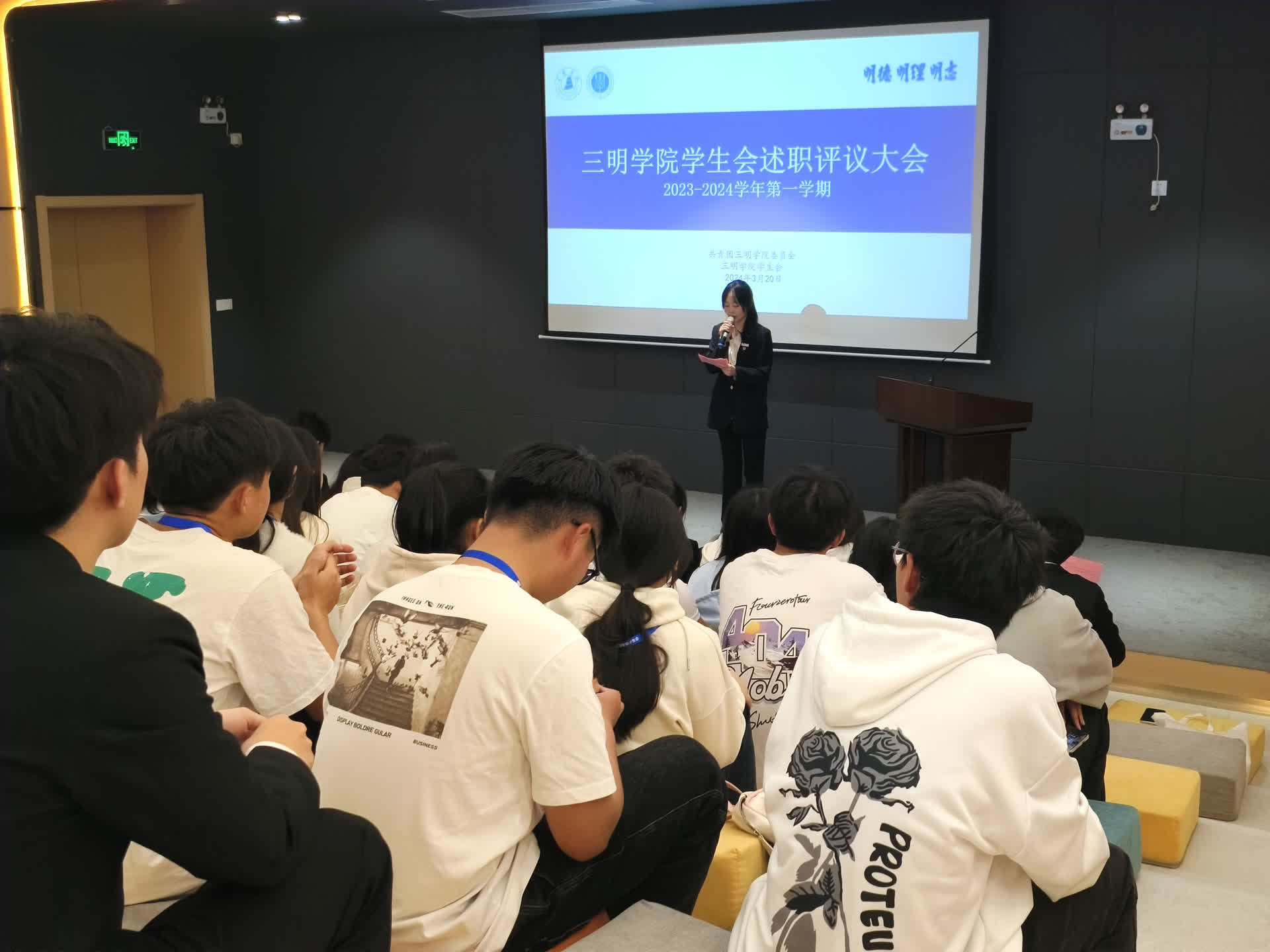 为进一步推进学生会组织深化改革,总结工作经验,创新工作思路,支持和引导学生会更好地服务青年学生成长成才,3月20日中午,三明学院学生会在南区学生活动中心一楼报告厅举行2023-2024年第一学期述职评议大会。校团委负责老师、校学生会骨干以及来自二级学院的学生代表共计七十余人参会。