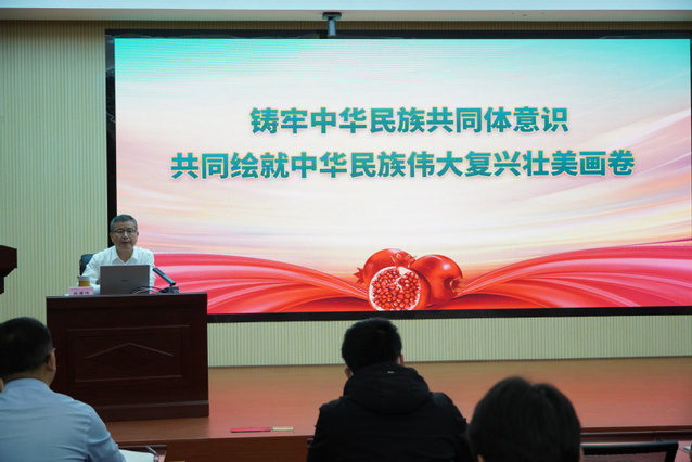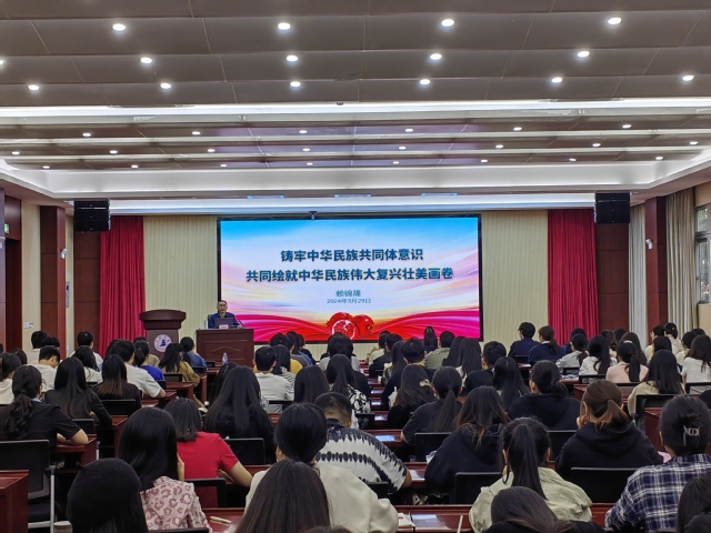 张君诚以“铸牢中华民族共同体意识,共同绘就中华民族伟大复兴壮美画卷”为题,从中华民族多元一体的基本国情开篇,详细阐述铸牢中华民族共同体的基本理念、战略意义、实践路径及明院做法等四个方面内容,深入剖析中华民族共同体意识背后所蕴含的深厚历史积淀和重要的现实意义,引导同学们牢固树立“休戚与共、荣辱与共、生死与共、命运与共”的共同体理念,努力讲好民族团结进步故事,自觉做民族团结进步的忠实维护者。