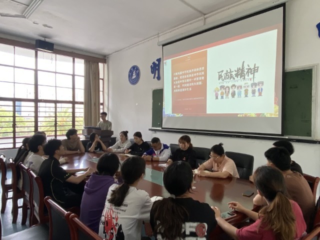 随后,来自布依族的陈正波同学、来自苗族的杨芳同学用生动的语言和丰富的图片,介绍了各自民族的习俗和文化特色。杨芳同学还开启了苗语小课堂,带领现场师生感受苗语音韵的优美,现场气氛轻松愉快。