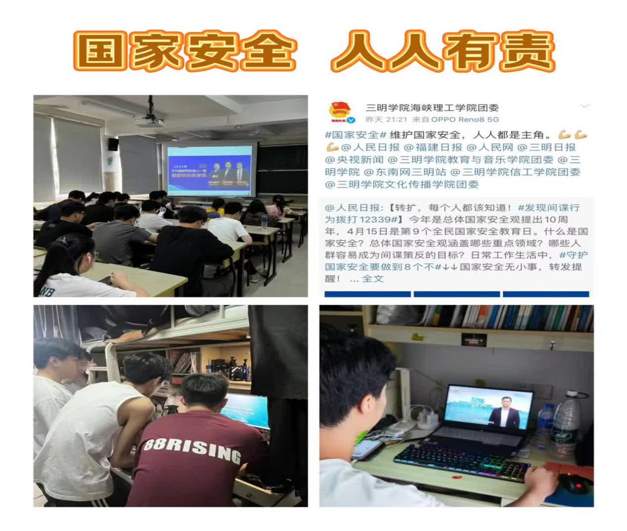 4月14日,学院组织权益部成员与各班级宿舍长集中观看“千万高校学生同上一堂国家安全教育课”,一同聆听国家安全领域专家学者讲解总体国家安全观的概念内涵、金融安全、军事安全等丰富内容,引导大学生深刻感受10年来国家安全工作取得的巨大成就。4月10日至14日,学院组织学生在宿舍集中观看国家安全教育相关视频素材,并以宿舍为单位开展线上国家安全知识竞答、观后感征集等活动,正面引导广大学生关注国家安全。此外,学院还通过QQ群、微信群、微博客户端等同学们喜闻乐见的传播方式开展国家安全主题宣传教育,使广大师生了解国家安全政策与法律法规,形成学法用法维护国家利益的良好氛围。