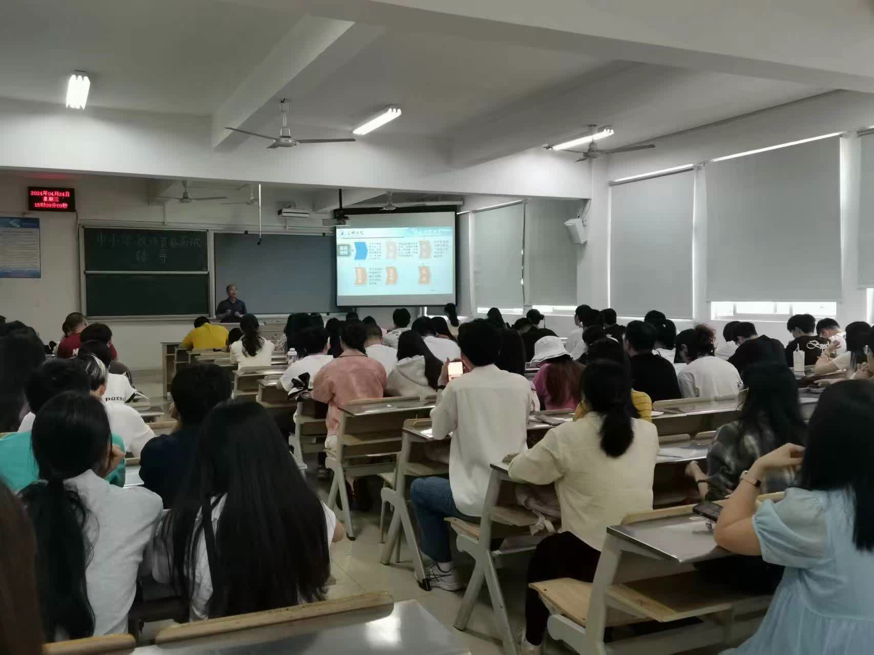 4月24日下午,教务处(师范教育中心)与继续教育学院联合举办的教师资格证面试指导讲座在博学楼201室开讲,由公共教育理论课教研室主任吴旭平副教授主讲,全校130余名师范生到场聆听。