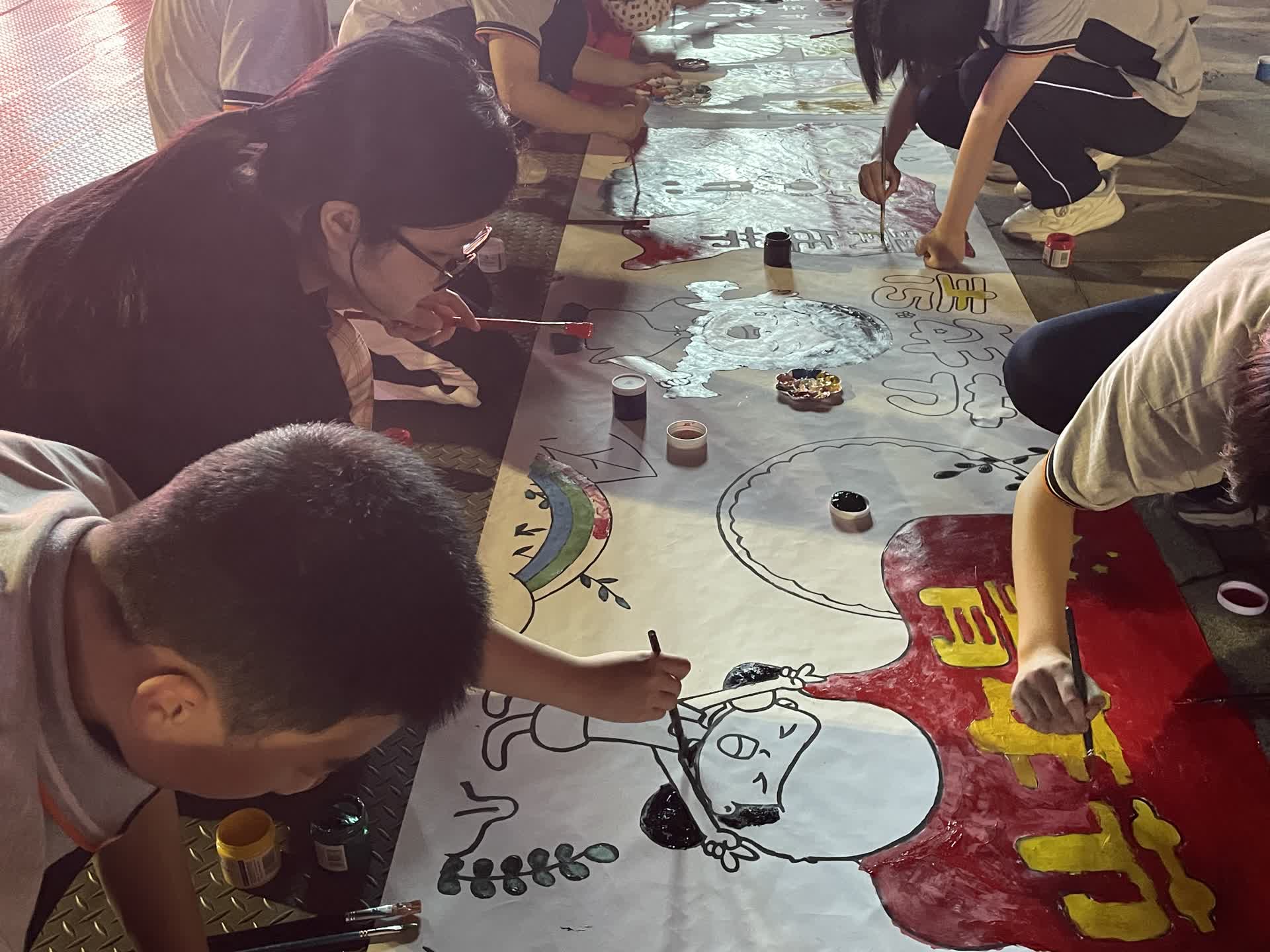 9名来自教育与音乐学院的团员学生共创集体涂鸦——《不忘初心,砥砺前行》红色纳斯卡巨画。他们专心致志投入此次志愿服务活动,在舞台节目进行的同时组织30位学生,分工好绘画模块,于台下同步绘画,带领他们一起用一笔一画绘就青春色彩,谱写青春之歌。节目的最后大家一起上台展示40分钟内的努力成果,以画为体,以史为魂,舞台的绚丽灯光与画卷鲜艳靓丽的颜色折射出了青年们朝气蓬勃的力量。