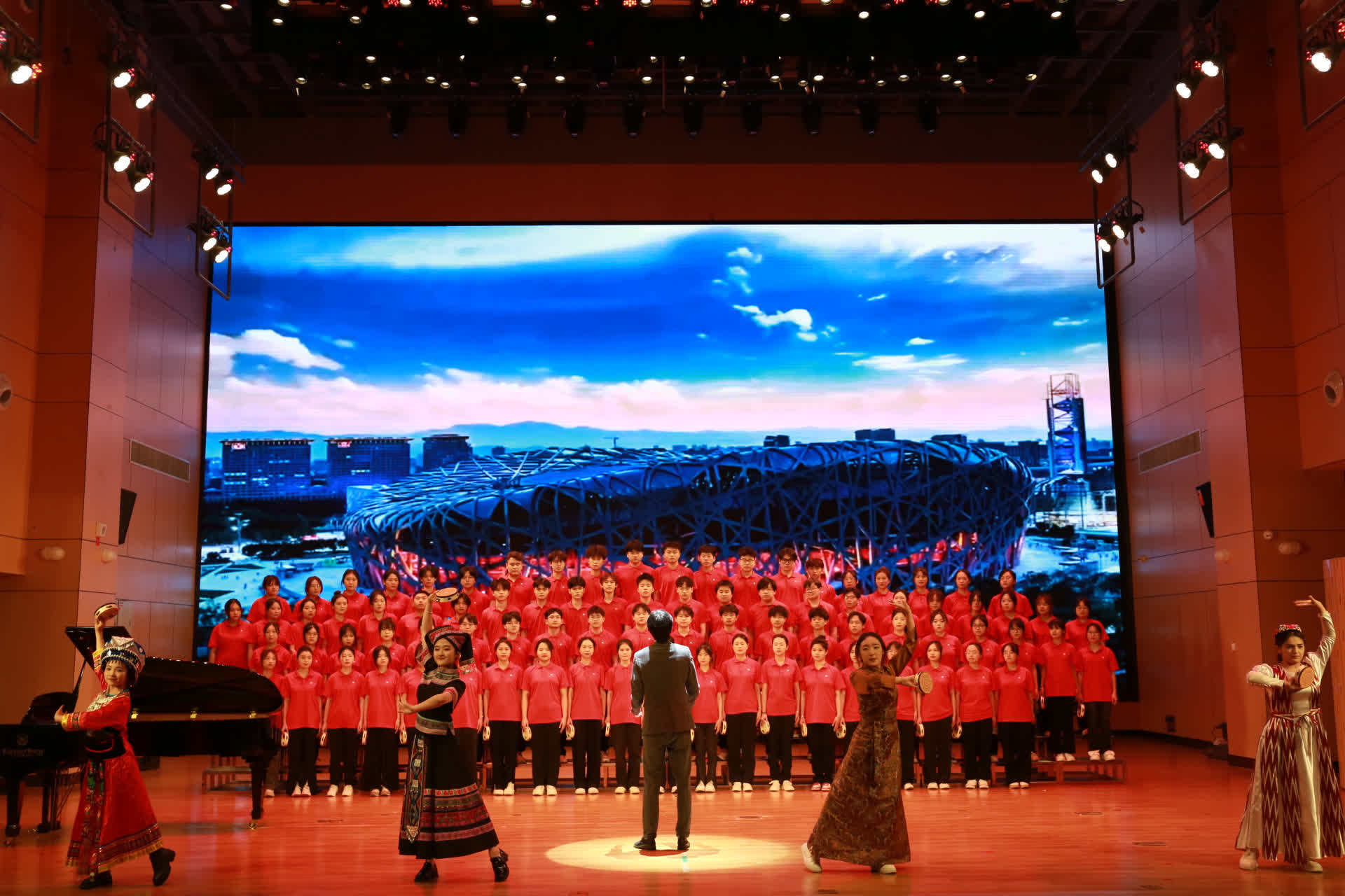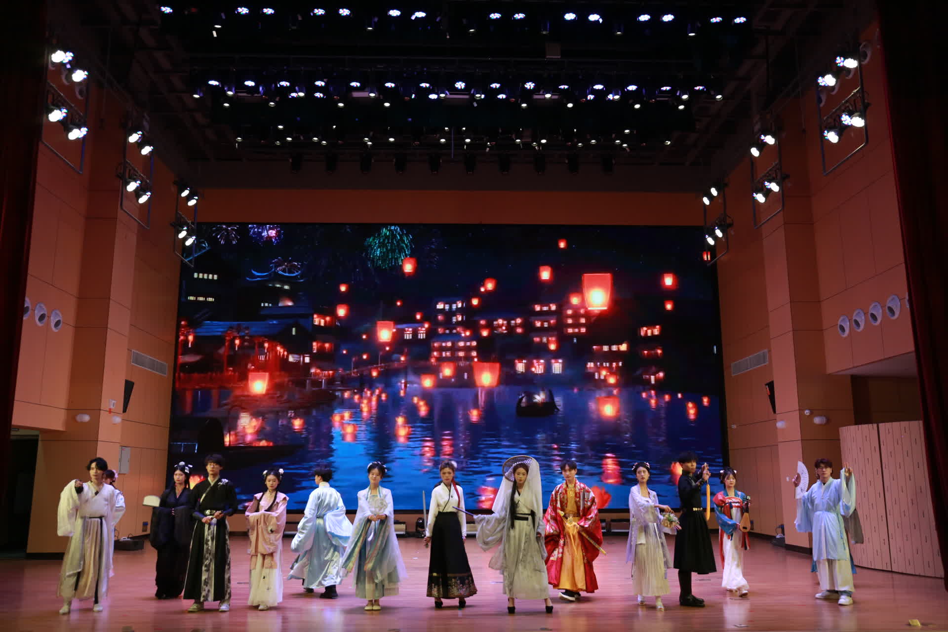 晚会分为三大篇章,十七个节目,分别为“峥嵘岁月,往昔足迹”、“奋楫笃行,逐梦遮光”和“扬帆起航 奋进明院”,每个篇章都紧扣主题,呈现出一场青春的盛宴。晚会开篇,华服秀《礼裳中华 锦绣宏图》为观众带来了一场视觉盛宴。五彩斑斓的华服如诗如画,每一件都承载着中华五千年的文明历史。舞者们身着华服,优雅地穿梭在舞台之上,仿佛带领观众穿越时空,领略中国优秀传统文化的博大精深与独特魅力。街舞《华夏》紧随其后,将现代元素融入传统,展现了青年学子对传统文化的热爱与传承,同时也彰显了他们的蓬勃朝气与无限可能;第二篇章:奋楫笃行,逐梦遮光。情景剧《平芜尽处是春山》以生动的演绎展示了学生们面对困难时的坚韧与乐观,他们不畏挑战,勇往直前,用青春书写着属于自己的精彩篇章。歌曲串烧《青春印记》更是唤起了大家对青春的无限怀念,每一首歌都代表着一个阶段的青春回忆,让人感慨万分;第三篇章:爱国情怀,共筑梦想。由台湾老师翁锦栋教授创作并领唱的歌曲《热血耀芳华》将晚会推向高潮,歌曲以激昂的旋律歌颂了祖国的大好河山,激起了在场每一位观众的爱国之情,他们用自己的歌声传递着对祖国的深深热爱和对未来的美好期许。