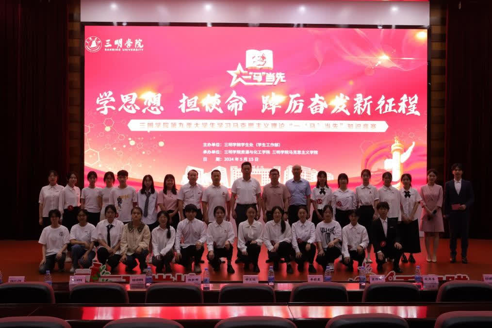 为深入开展学习贯彻习近平新时代中国特色社会主义思想主题教育,坚持不懈用习近平新时代中国特色社会主义思想铸魂育人,5月15日,三明学院第九季大学生学习马克思主义理论“一‘马’当先”知识竞赛决赛于行政楼附楼学术报告厅顺利举行。本次竞赛由三明学院学工处主办、资源与化工学院与马克思主义学院共同承办,校党委李莉星副书记、组织部、宣传部、学生处、校团委负责人莅临决赛现场指导,来自12个二级学院的党委副书记、全体辅导员和学生代表们临场观摩。