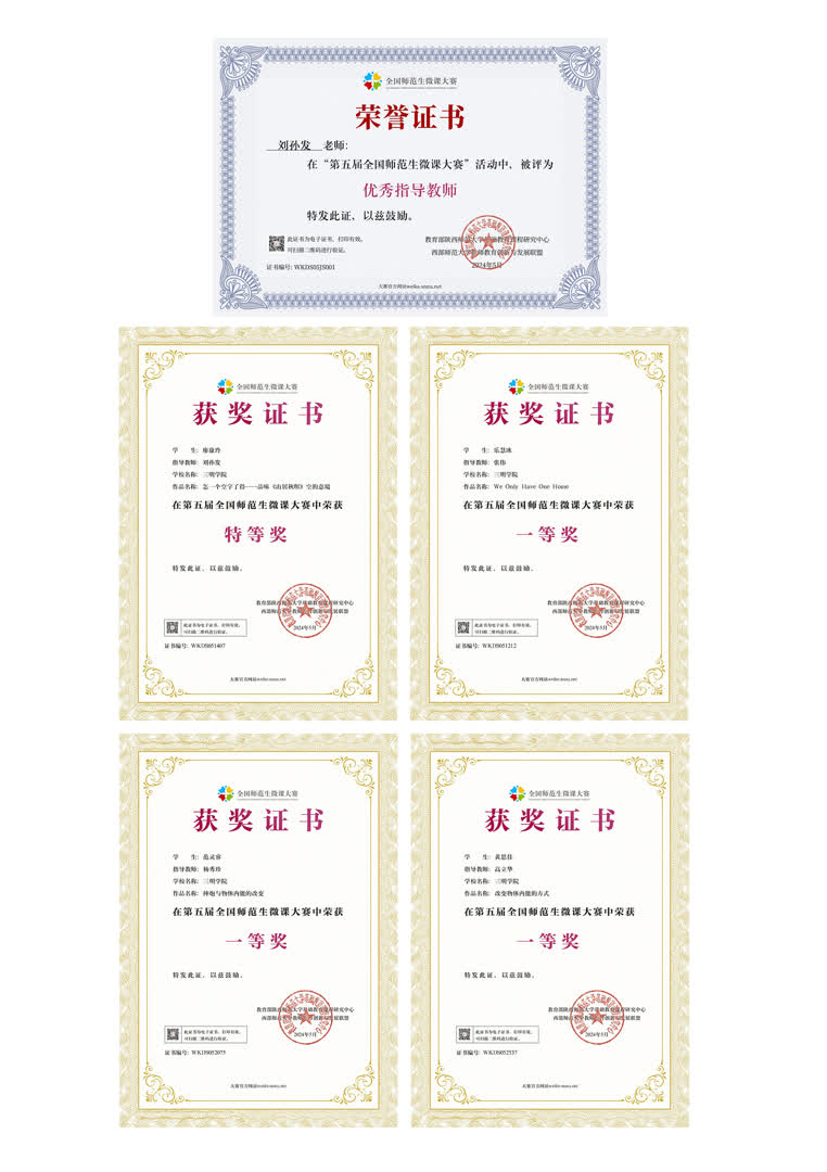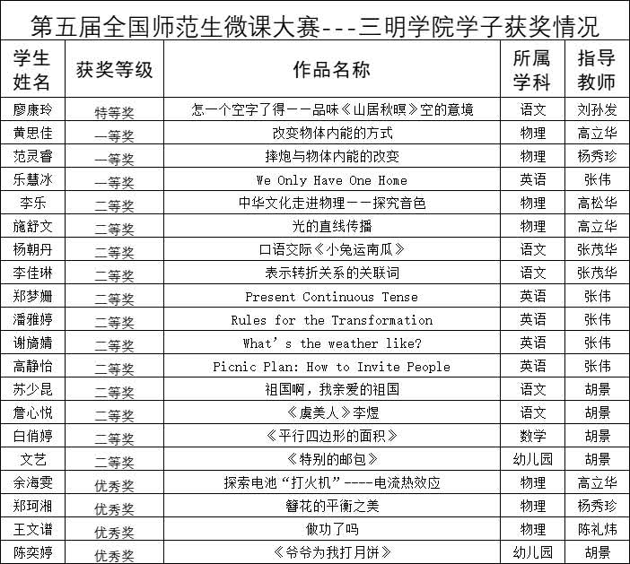 近日,第五届全国师范生微课大赛落下帷幕,三明学院学子在此次大赛中取得特等奖1个、一等奖3个、二等奖12个和优秀奖4个的优异成绩。同时,三明学院荣获“优秀组织单位”称号,教师刘孙发被评为“优秀指导教师”。