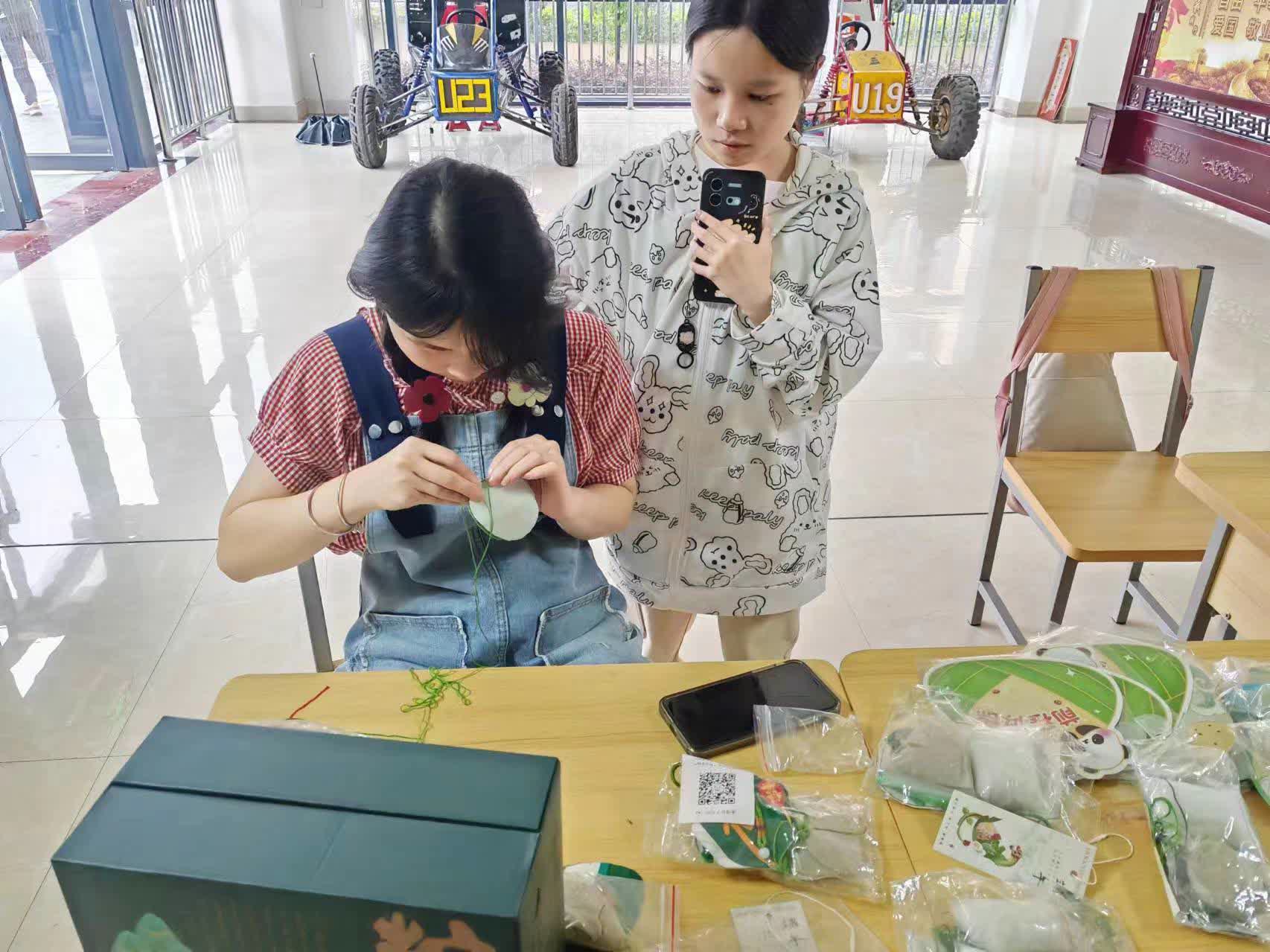 活动现场,色彩斑斓的中国结和香包迎风摇曳,散发着浓郁的传统文化气息,吸引了众多学生驻足观赏。在手工制作区域,志愿者们热情洋溢,耐心细致地向同学们传授编织中国结和制作香包的技艺。同学们纷纷动手实践,不仅锻炼了动手能力,更在亲身参与中感受到了传统手工艺的独特魅力。