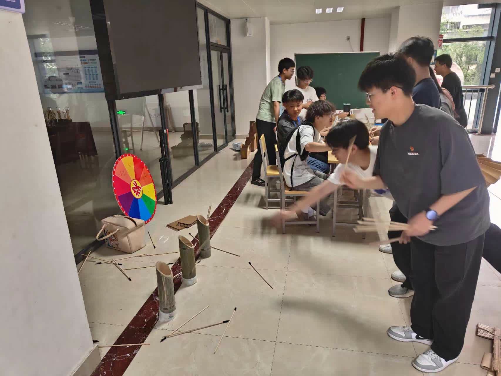 除了手工制作,投壶游戏也成为了现场的一大亮点。同学们手持箭矢,瞄准目标,争分夺秒地投掷,展现出了中国古代游戏的风采。现场气氛热烈,欢呼声、掌声此起彼伏,将活动推向了高潮。