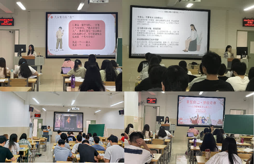 心理赋能,温暖前行。学院组织各班级、“一站式”学生社区开展了以“善爱自己·梦绘青春”为主题的心理健康教育主题班会。辅导员及心理委员通过讲解心理健康教育知识,开展了心理知识竞答、观看学院心理剧视频等方式,引导同学们树立阳光心态,关注自我心灵,给心理赋能。