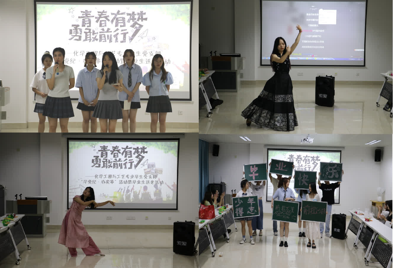 骊歌悠扬,逐梦向未来。支部师生党员用心策划了毕业生送老晚会,用载歌载舞的方式为毕业生送上特别的礼物。支部师生党员表演了国风走秀、古典舞《怎叹》、《相思谣》,与毕业生同台演唱《我们的明天》、《紫荆花盛开》等歌曲。现场还进行毕业心语环节,感动了在场的毕业生。最后,师弟师妹手写粉笔字当祝福献给毕业生。