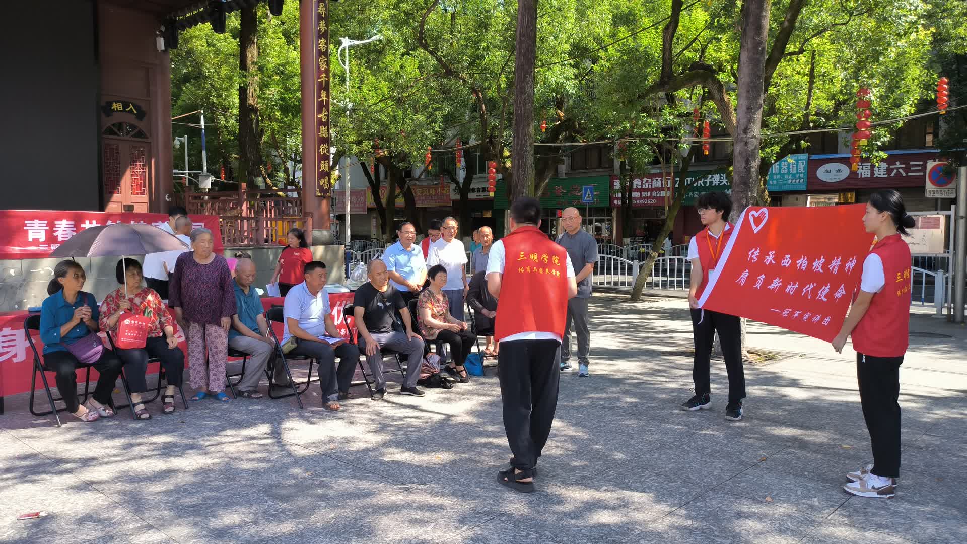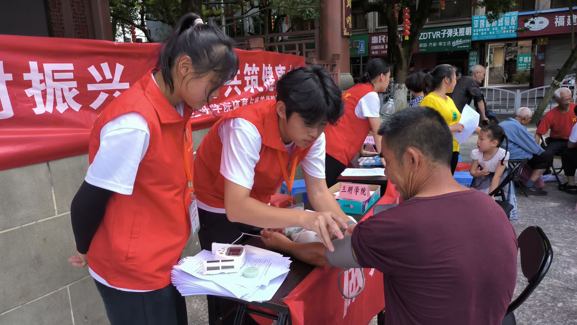 在治平乡、宁化县翠园广场,实践队成员成为了这里最亮丽的风景线。镜头聚焦到实践队成员杨秋林身上,他正温柔地指导一位老奶奶进行肩部肌肉的拉伸,细致入微的动作中透露出对康养服务的专业与热情。与此同时,广场上,实践队的身影忙碌而有序:有的队员化身为健康小卫士,耐心地为过往群众测量血压、体脂率和握力,用数据为他们把脉健康;有的则运用专业的按摩手法,为需要的人提供舒适的康养体验,缓解身体的疲惫;更不乏成员化身为健康宣传大使,以生动的语言和鲜活的实例,向群众普及“运动促健康”的科学理念,激发大众参与体育锻炼的热情。