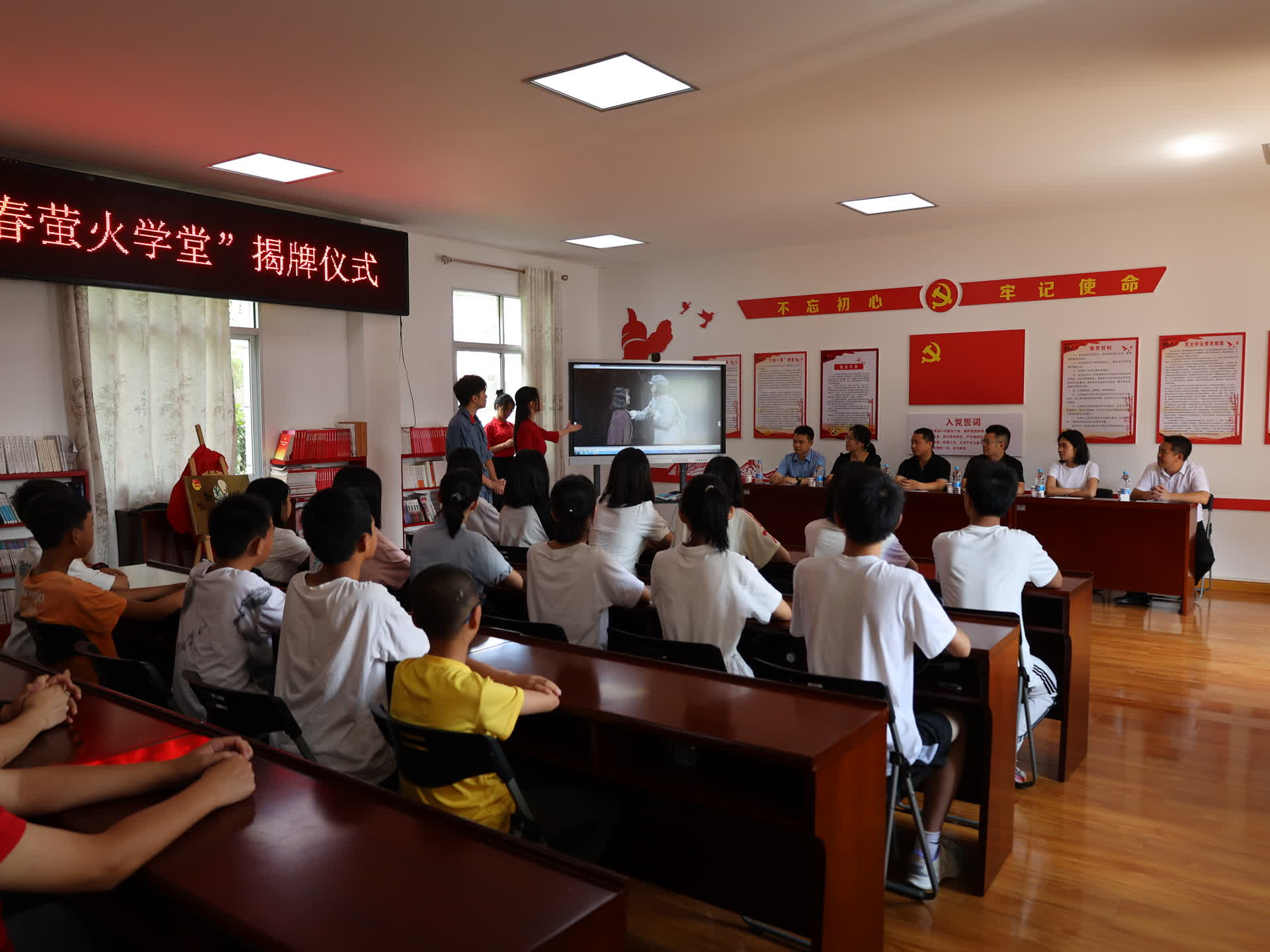 7月9日,三明学院文化传播学院常青藤支教实践团前往宁化县民族学校举行“青春萤火学堂”揭牌仪式暨“三色萤火点亮青春”支教开班仪式。三明学院团委负责人、宁化县治平乡负责人、宁化县团委负责人、三明学院文化传播学院、宁化县民族学校等46名师生出席本次仪式。