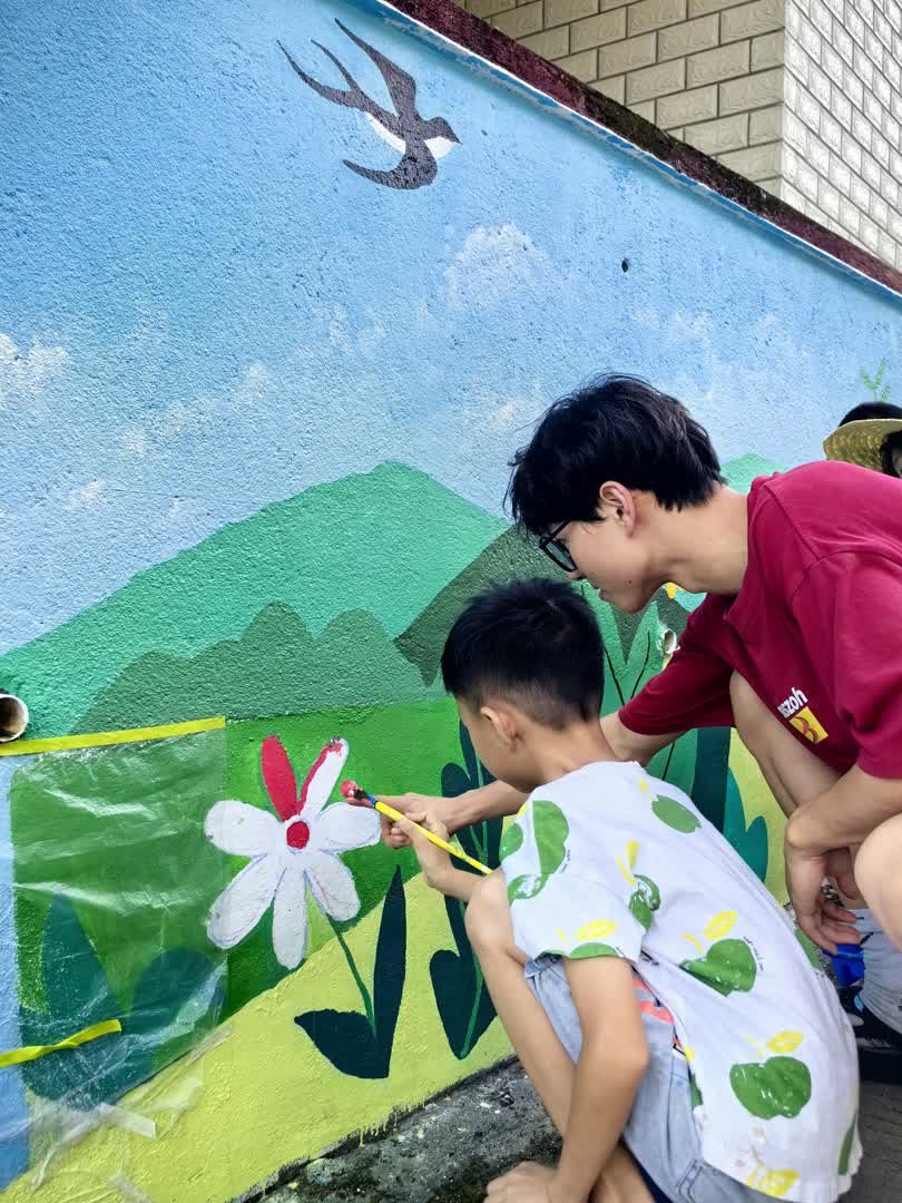 调色、勾边、上色、调整……实践队分工合作,配合默契,以墙为布,以笔绘情,手把手带着当地留守儿童将白莲风景等一步步绘于墙上,创作出一幅幅精美的墙绘作品。用色彩缤纷的墙绘提升白莲的“颜值”,同时也将墙绘过程转化为一堂生动的美术课,点亮孩子们的绘画梦,培养孩子们发现美、感受美、鉴赏美和创造美的能力,以艺术赋能乡村美育。