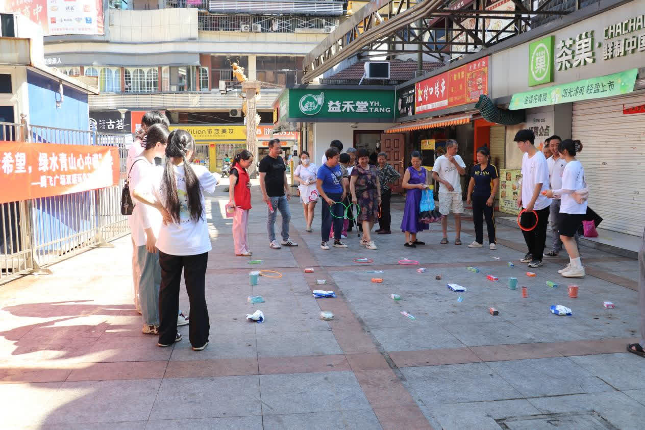 实践队到达三元区腾飞广场后,在广场上悬挂“双碳环保”宣传横幅,吸引着街边行人的围观。过程中,实践队员主动上前与路人互动,通过互答提前准备的“双碳环保”生活小知识、讲解“双碳”知识以及河流治理行动的相关制度等方式,为行人普及节能降碳的生活方式和增加对母亲河治理行动的关注。实践队还将各种常用的生活用品作为此次“双碳环保与河流治理行动”科普教育的奖品,通过套圈的活动形式提升活动的吸引力和趣味性,并设置言简易答的调查问题,吸引居民参与其中。