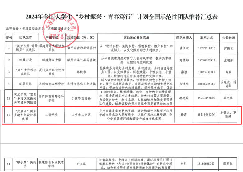 近日,由中央宣传部、教育部、共青团中央、全国学联联合开展的2024年全国大学生暑期文化科技卫生“三下乡”社会实践活动全国重点团队名单以及由共青团中央青年发展部主办中国农业银行支持的2024 年全国大学生“乡村振兴·青春笃行”计划全国示范性团队名单公布,三明学院闽台乡土微景观营造学社项目驱动创新班、“兴启点”闽台乡建乡创设计服务团2支团队分别成功入选。