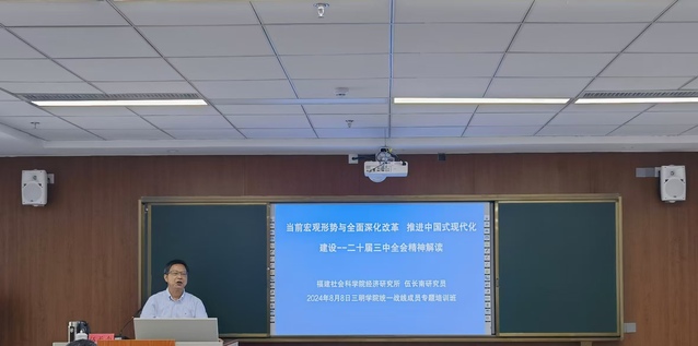 8月8日,福建社会科学院经济研究所原所长、研究员伍长南为支部全体党员带来了《当前宏观形势与全面深化改革,推进中国式现代化建设——二十届三中全会精神解读》专题授课。9日,支部党员前往平潭综合实验区主题党日馆参观学习,并召开党的二十届三中全会精神传达学习会。