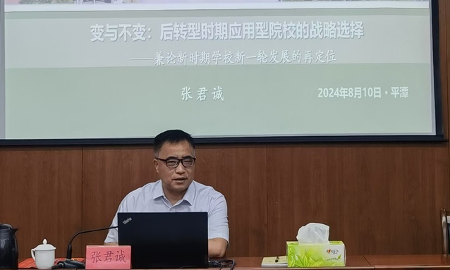 校党委副书记、校长张君诚教授应邀为培训班作题为《变与不变:后转型时期应用型院校的战略选择——兼论学校新一轮发展的再定位》的专题报告,从“应用型转型、塑形与成型”“变与不变:后转型时期学校发展的再定位”“新时期院校分类管理评价与思考”,阐述了地方应用型本科高校内涵发展、特色发展、分类发展的科学内涵及时代价值,引导全体学员深入思考和努力探索应用型院校后转型时期的新一轮再定位与再分化的实践路径。