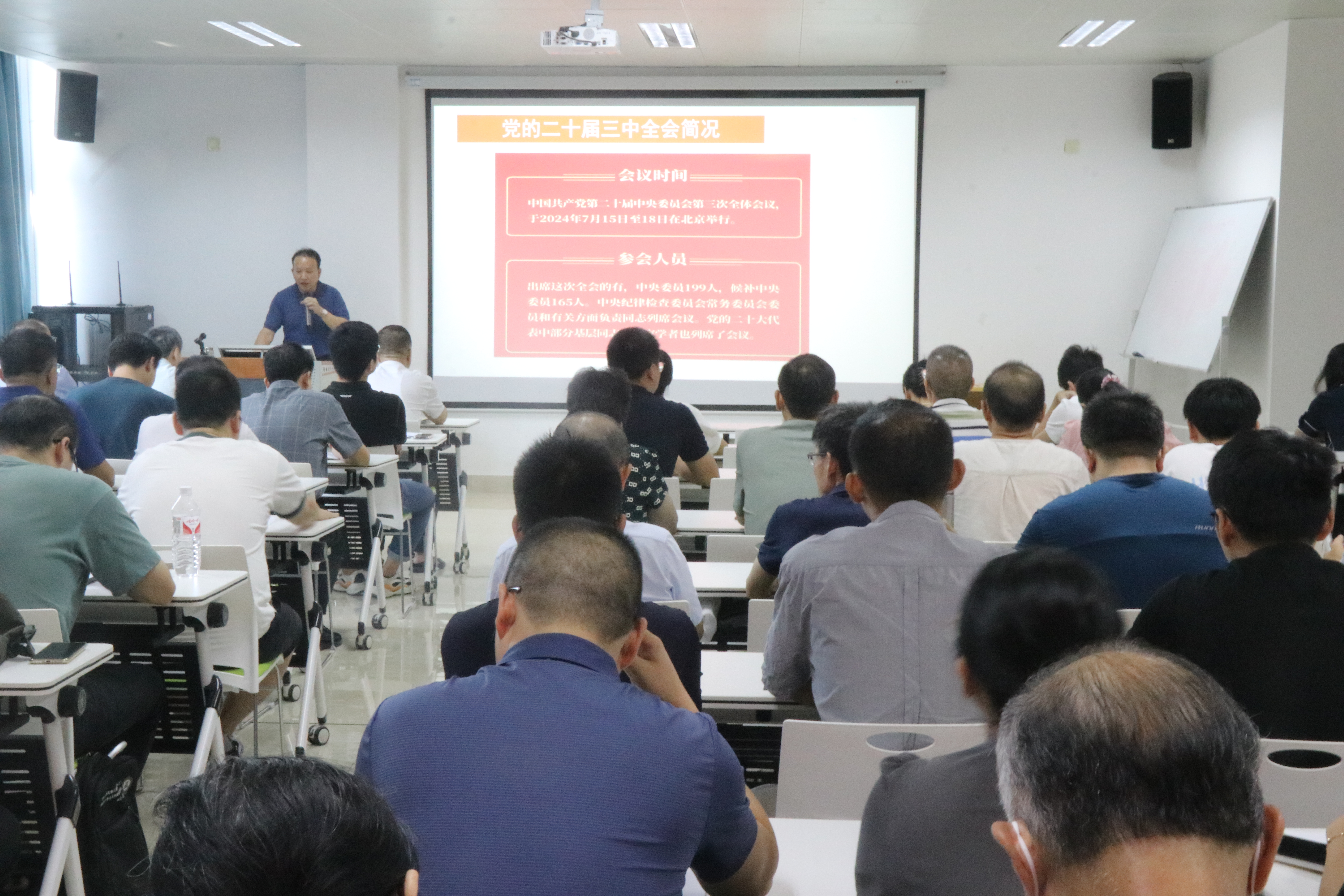 会上,学院党委负责人以“深入学习宣传贯彻党的二十届三中会精神”为题,组织大家学习了党的二十届三中全会精神,重点解读了《中共中央关于进一步全面深化改革 推进中国式现代化的决定》(经下简称《决定》)的主要内容。会议强调,学习宣传贯彻党的二十届三中全会精神是当前和今后一个时期的一项重大政治任务。各基层党组织要认真组织全院师生党员群众,深入学习领会全会精神,切实把思想和行动统一到全会精神上来,深刻领会和把握进一步全面深化改革的主题、重大原则、重大举措、根本保证,接续奋进、开拓创新,上下齐心协力抓好《决定》贯彻落实,把智慧和力量凝聚到落实全会作出的战略部署上来,把进一步全面深化改革的战略部署转化为推进中国式现代化的强大力量,在推进中国式现代化建设中谱写学校、学院高质量发展新篇章。会上,组织学习了《关于弘扬教育家精神加强新时代高素质专业化教师队伍建设的意见》,会议强调,新时代教师队伍建设要坚持以习近平新时代中国特色社会主义思想为指导,深入贯彻党的二十大和二十届二中、三中全会精神,坚持党对教育事业的全面领导,贯彻新时代党的教育方针,落实立德树人根本任务。新时代教师队伍建设要以教育家精神铸魂强师,提升教师教书育人能力,健全师德师风建设长效机制,深化教师队伍改革创新,加快补齐教师队伍建设突出短板,强化高素质教师培养供给,优化教师资源配置,打造一支师德高尚、业务精湛、结构合理、充满活力的高素质专业化教师队伍,为加快教育现代化、建设教育强国、办好人民满意的教育提供坚强支撑。
