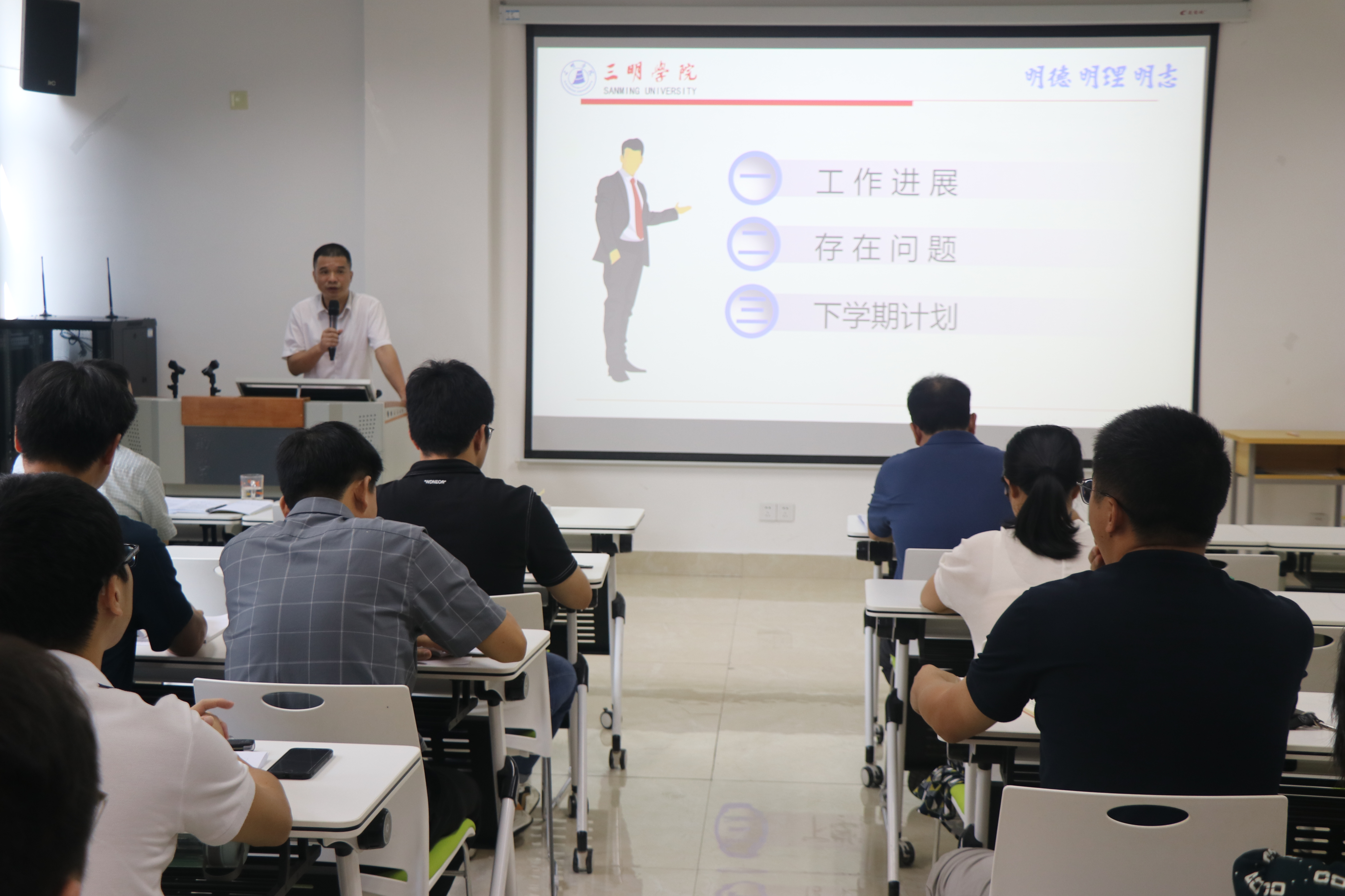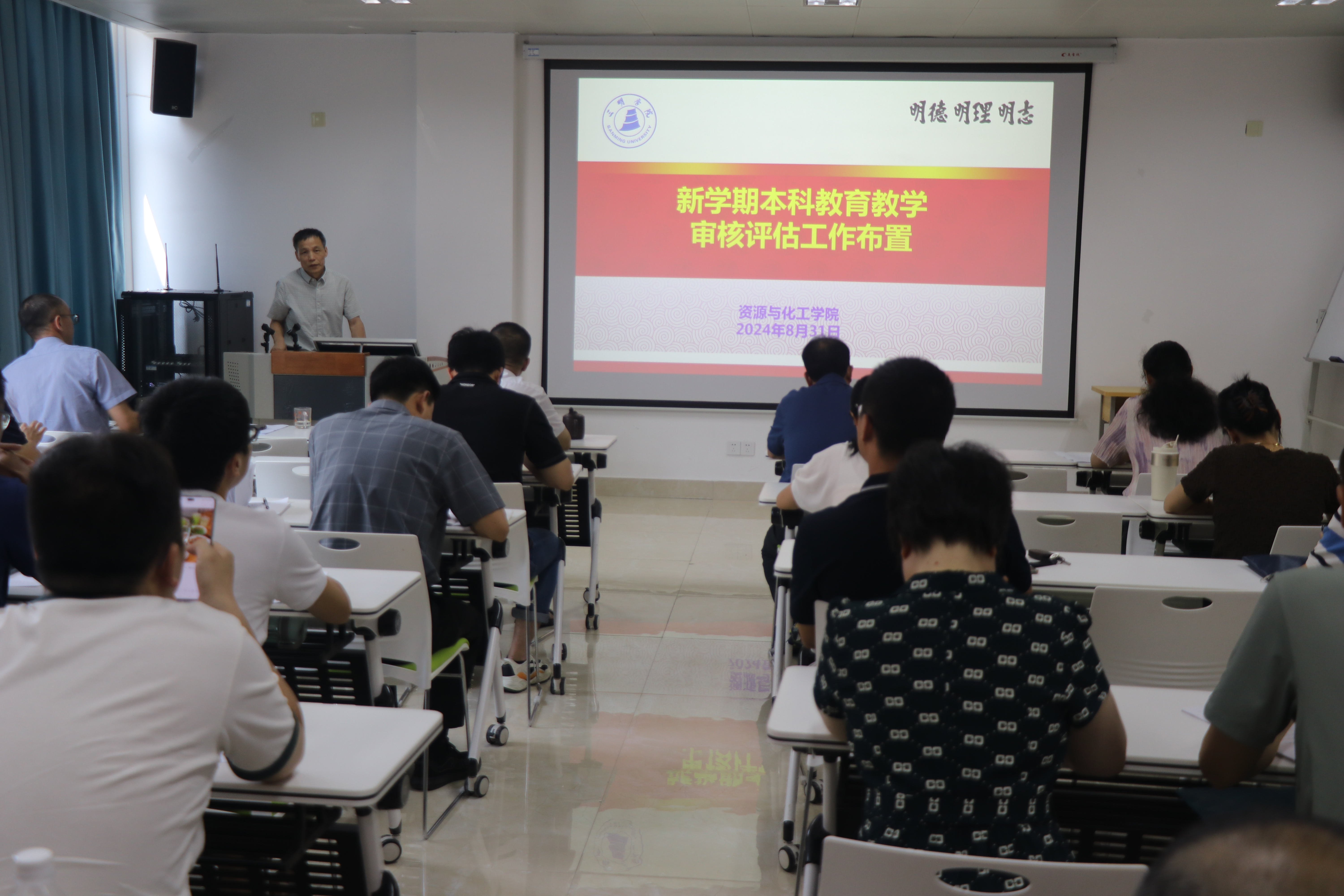 会议对新学期本科教育教学审核评估工作进行了专题辅导,此外还围绕科研立项、就业攻坚、开学初教学准备工作、2024级迎新工作等内容进行了布置。会议最后对2023-2024学年师德师风年度考核工作进行布置并开展同行评议。