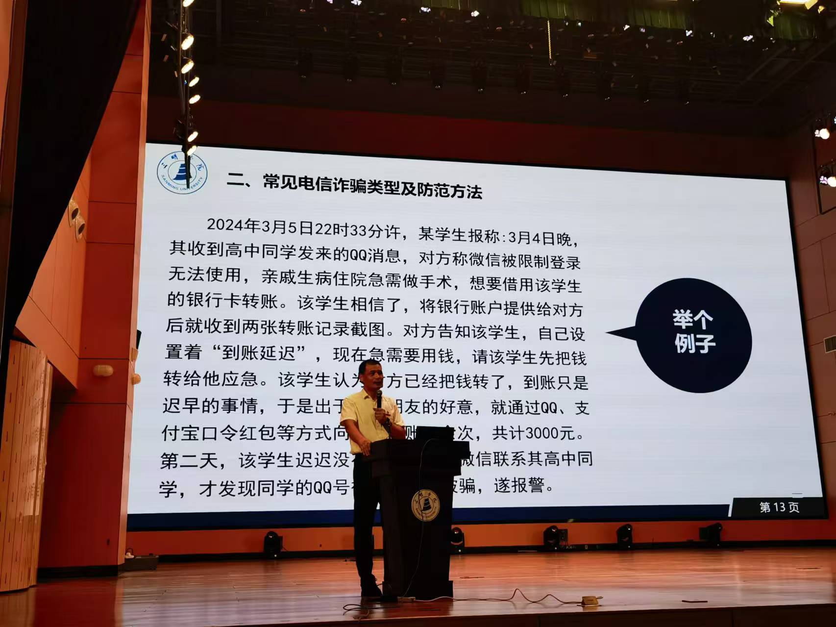 陈凡副处长以其深厚的专业素养和实战经验,化身反诈领域的“守护神”,为青春航程筑起坚不可摧的“防火墙”。他在讲座中详细介绍了大学生与电信诈骗的距离,常见电信诈骗类型及防范方法,以及国家反诈APP的使用和学习生活中的安全问题。他通过列举一系列真实案例,深入浅出地分析了常见电信诈骗类型,提醒新生们要有一定的判断能力。同时,他还就如何维护自身权益、防范方法等方面进行了详细讲解,为新生们提供了实用的生活帮助。他强调,大学生要做到“不轻信、不透露、不转账、不扫码、不点击链接、不接听转接电话”。遇到诈骗,请在第一时间内拨打校园报警电话:8398110,保存好微信、QQ聊天记录,银行卡、支付宝等转账记录,为警方提供第一手证据资料。