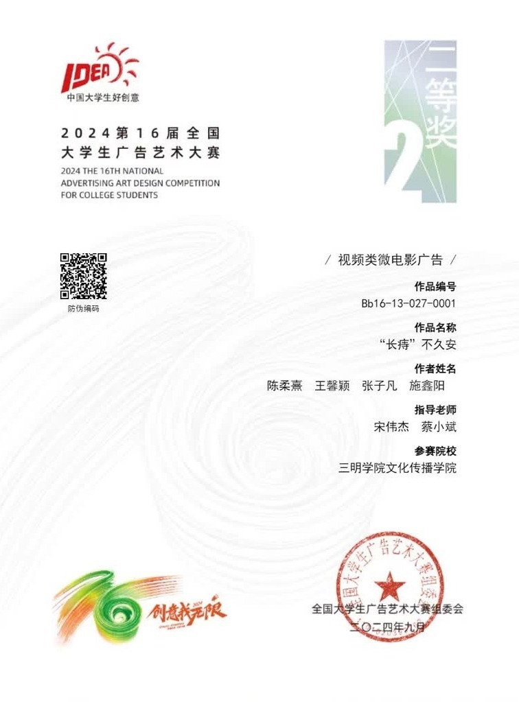 在大赛评比中,由宋伟杰老师和蔡小斌老师指导,陈柔熹、王馨颖、张子凡、施鑫阳四位同学的作品《“长痔”不久安》获得全国总评审二等奖。同时,由胡语思创作的作品《十分豆子》、江毅伟创作的作品《选他,信我。(凯迪仕K70“千里眼”智能锁)》分别在广告文案类别中荣获优秀奖;由唐嘉妍、付蓉、陈念苹、王曼玲、骆瑷玮创作的作品《美味莎布蕾 莎布蕾美味》在平面广告类别中荣获入围奖;由吴建瀚、杨晓蕊、刘颜硕创作的作品《蜂花shampoo,又fáng又hù》在广告文案类别中荣获入围奖;由杜欣怡,黄美如,冉雨玄,陈研研创作的作品《自在“逐光”》在短视频类别中荣获入围奖。