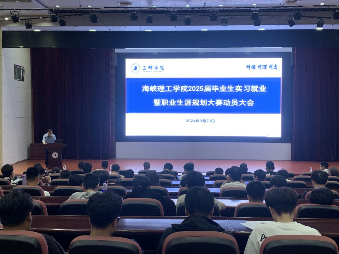为帮助毕业生正确认识当前就业形势,了解就业政策以及毕业实习相关事宜,9月23日晚,海峡理工学院在行政楼附楼学术报告厅召开2025届毕业生实习就业暨职业生涯规划大赛动员大会,学院党政领导、教学科、毕业班辅导员、2025届毕业班全体学生、非毕业班主要学生骨干参加动员大会,会议由院党委副书记陈勇主持。