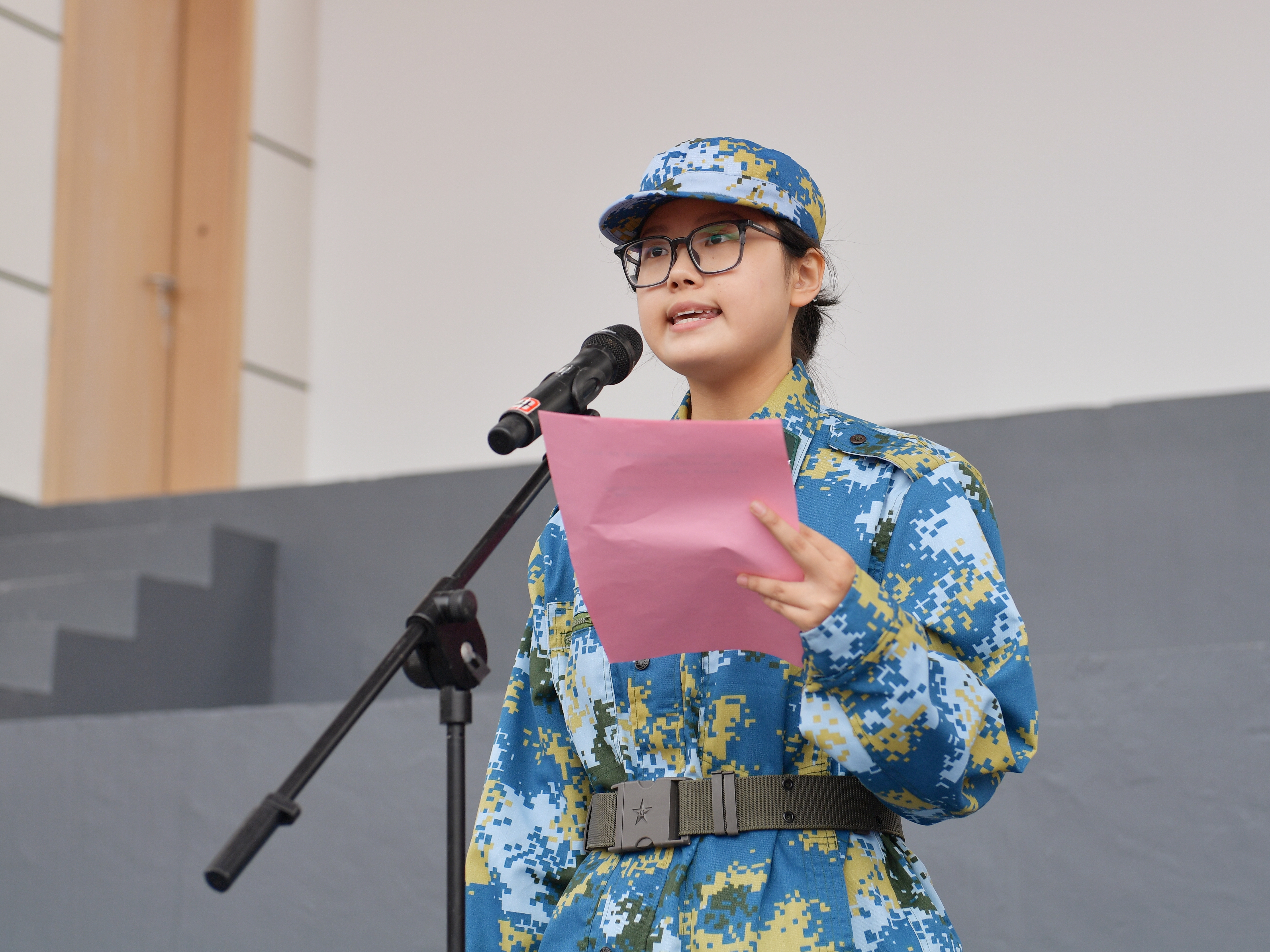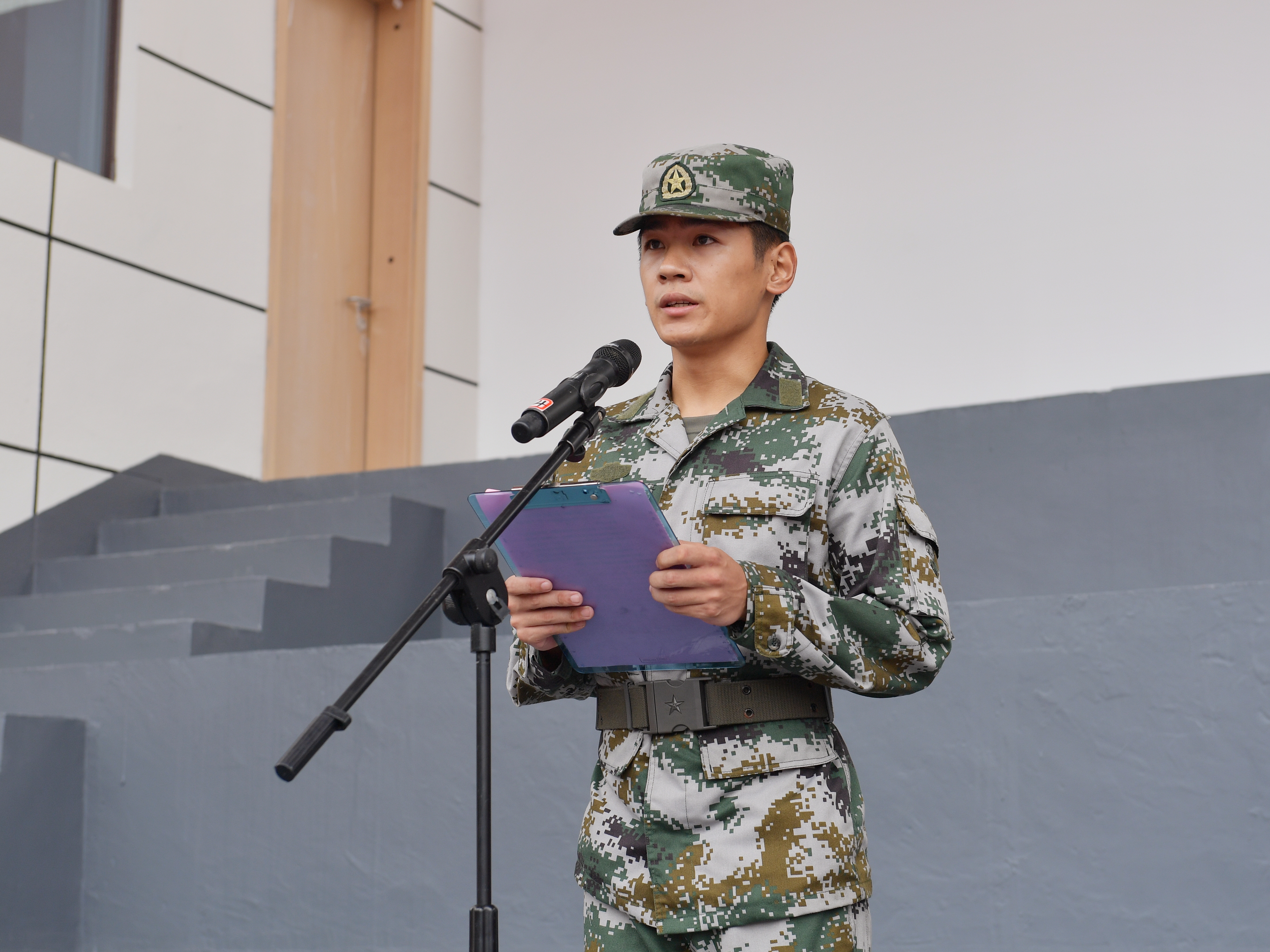 参训新生刘赵睿代表全体参训学生表态将在军训过程中认真刻苦,以军人的标准要求自己,不断磨练意志,培养优良作风。