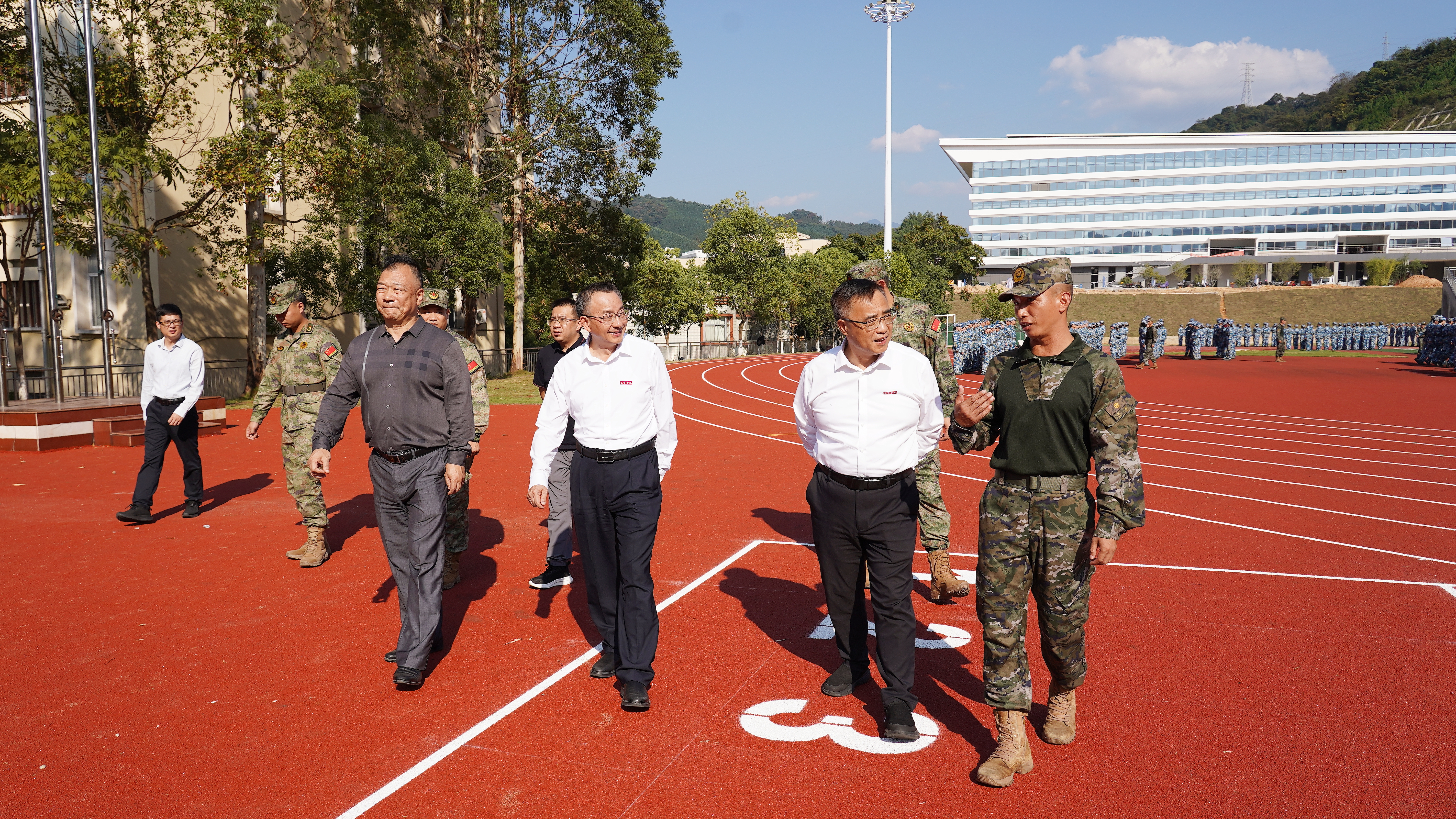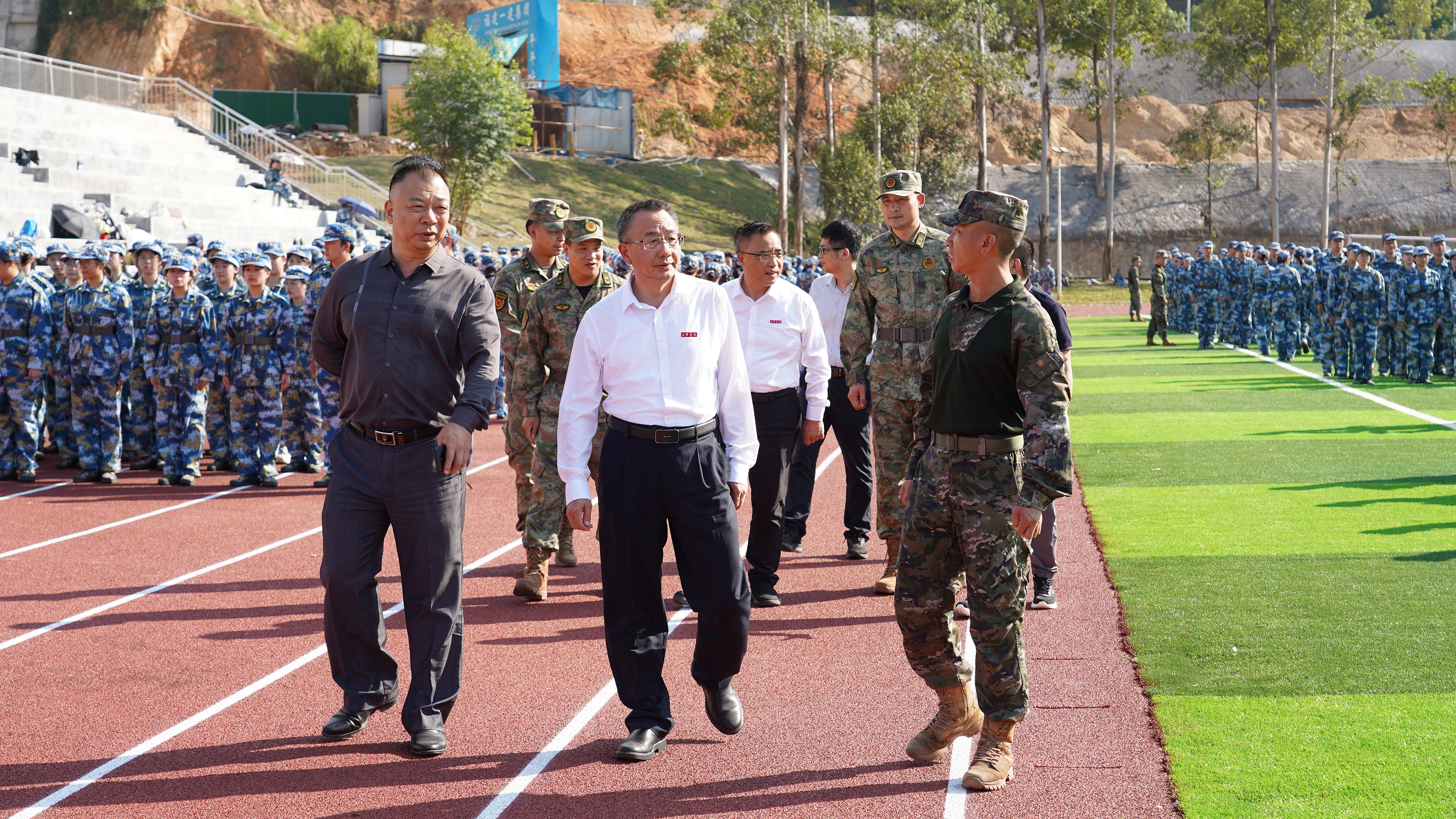 10月11日,校党委书记赖锦隆、校长张君诚前往南区田径场调研指导2024级新生军训工作。学生处、保卫处有关同志陪同。
