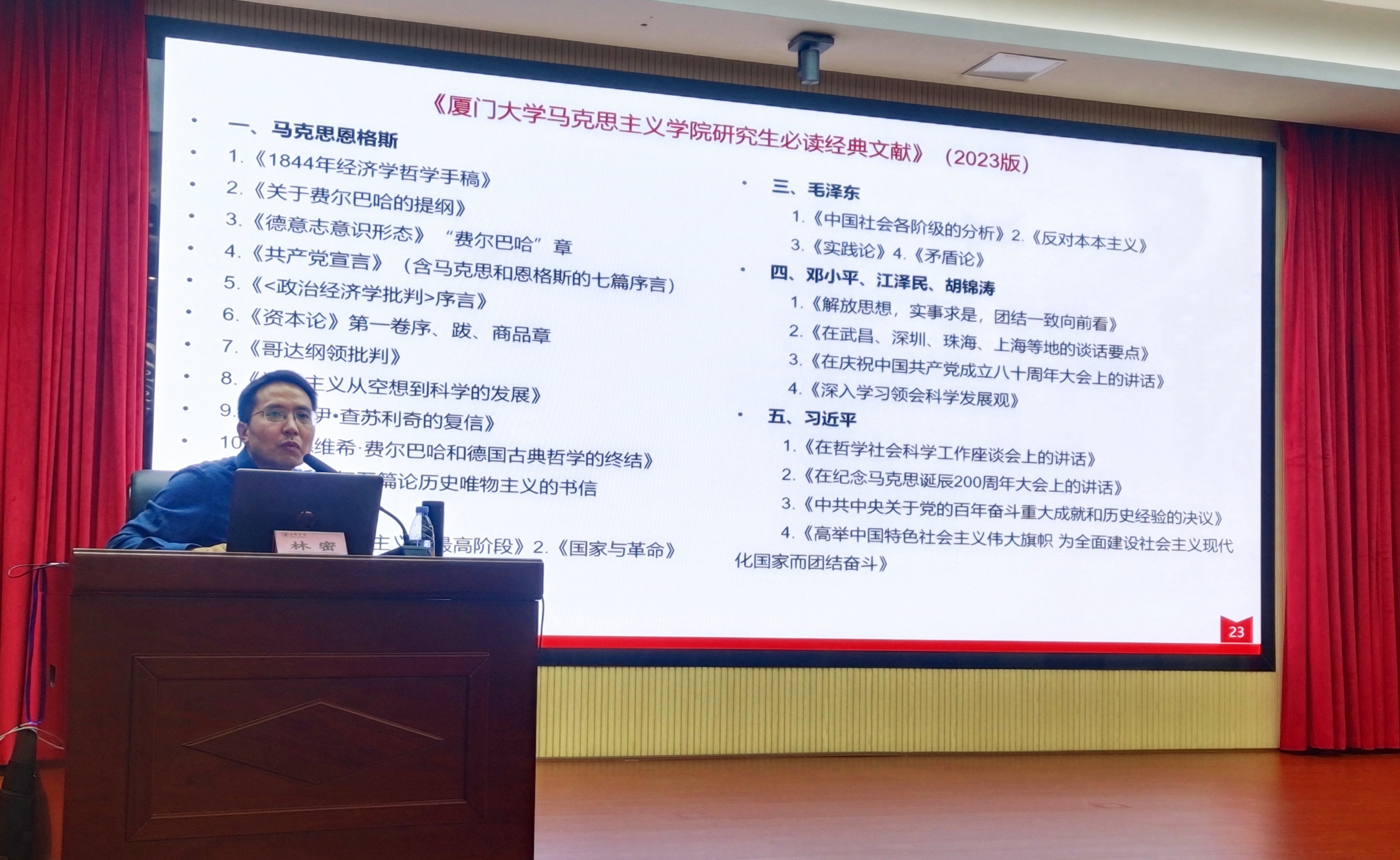 11月1日下午,厦门大学马克思主义学院副院长林密教授应邀为马克思主义学院师生作题为“读经典 悟原理 思入新时代——关于马克思主义经典著作研读的几点思考”的专题报告。本次讲座在北区三号会议室举行,马克思主义学院副院长欧阳秀敏副教授主持。