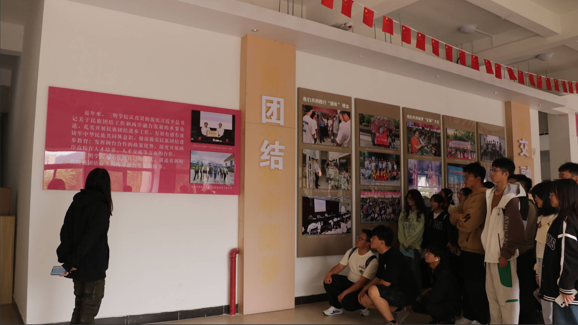 图文展板、实物陈列、视频影像……新生们实地浏览,了解中华民族的悠久历史和中华民族共同体理论。跟随讲解员的讲述,新生们进一步深入了解各民族交往交流交融的动人故事和新时代党的民族工作取得的历史性成就,深刻理解中华民族共同体意识的根脉和魂脉。