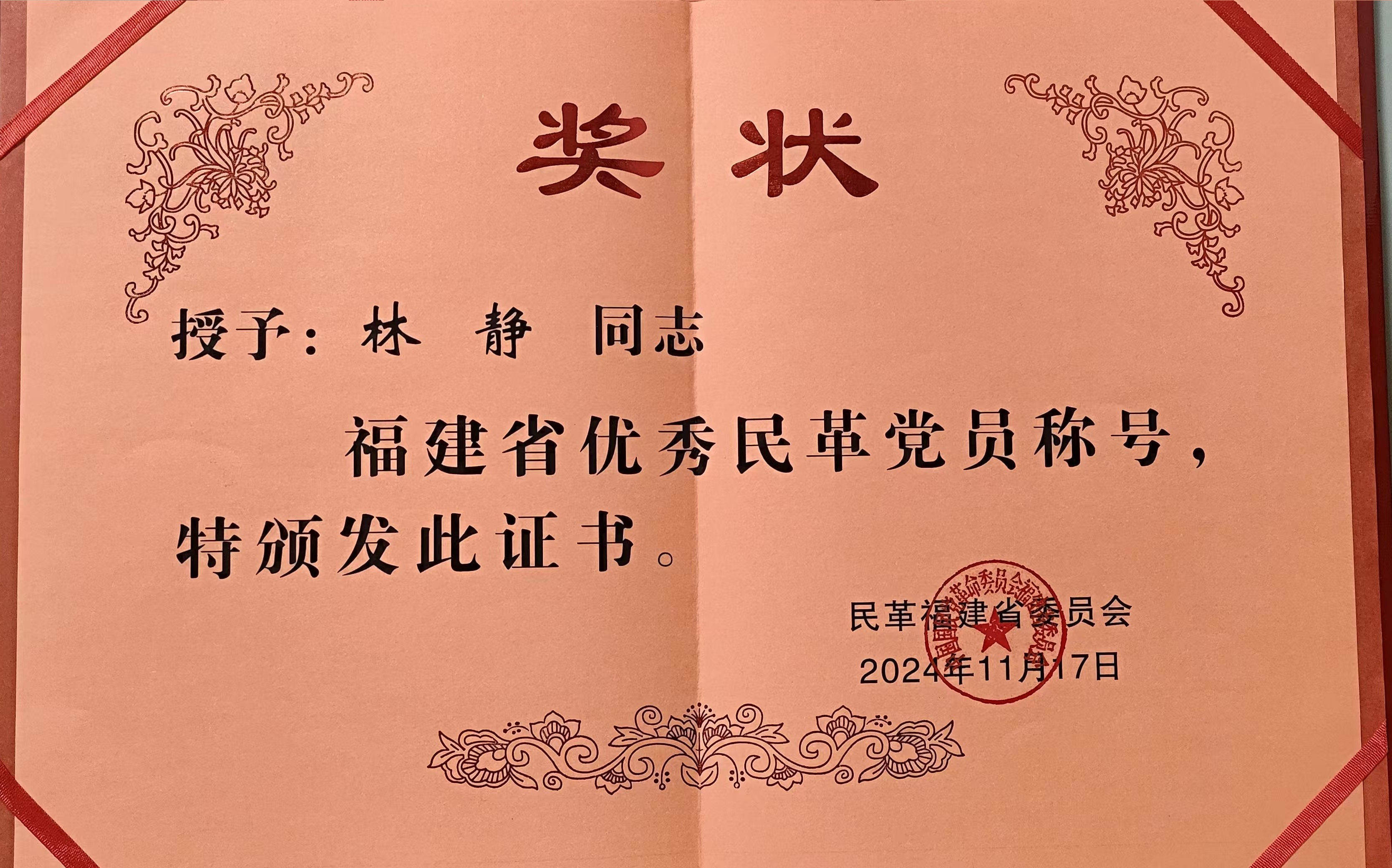近日,纪念民革福建省委员会成立70周年活动在福州举办,民革福建省委员会对全省先进集体和先进个人进行表彰。民革三明学院支部主委、三明学院科技处(社科处)副处长林静获授予“福建省优秀民革党员”称号。